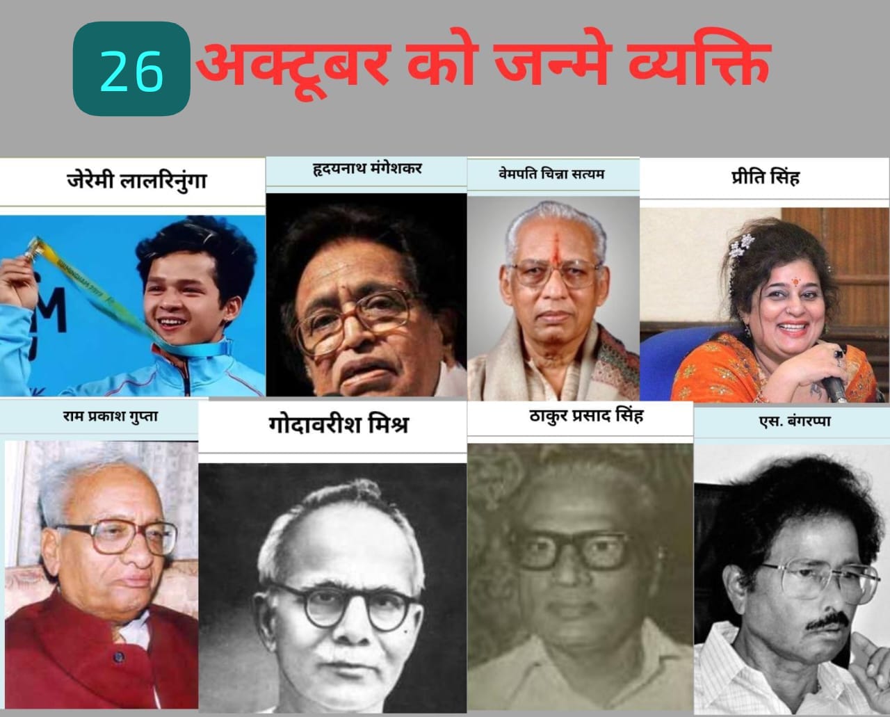 рднрд╛рд░рдд рдХреЗ рдЗрддрд┐рд╣рд╛рд╕ рдореЗрдВ 26 рдЕрдХреНрдЯреВрдмрд░ рдХрд╛ рджрд┐рди рдХрдИ рдкреНрд░рддрд┐рднрд╛рдУрдВ рдХреЗ рдЬрдиреНрдо рдХрд╛ рд╕рд╛рдХреНрд╖реА рд░рд╣рд╛ рд╣реИред рдЗрд╕ рджрд┐рди рдЬрдиреНрдореЗ рдорд╣рд╛рди рд╡реНрдпрдХреНрддрд┐рддреНрд╡реЛрдВ рдиреЗ рдЕрдкрдиреЗ-рдЕрдкрдиреЗ рдХреНрд╖реЗрддреНрд░ рдореЗрдВ рдЙрддреНрдХреГрд╖реНрдЯ рдпреЛрдЧрджрд╛рди рджреЗрдХрд░ рджреЗрд╢ рдХрд╛ рдирд╛рдо рд░реЛрд╢рди рдХрд┐рдпрд╛ред рдЪрд╛рд╣реЗ рд╕рд╛рд╣рд┐рддреНрдп рд╣реЛ, рд╕рдВрдЧреАрдд, рд░рд╛рдЬрдиреАрддрд┐ рдпрд╛ рдЦреЗрд▓тАФрдЗрди рд╕рднреА рдиреЗ рдЕрдкрдиреЗ рдХрд╛рд░реНрдпреЛрдВ рд╕реЗ рднрд╛рд░рдд рдХреЗ рдЧреМрд░рд╡ рдХреЛ рдирдИ рдКрдБрдЪрд╛рдЗрдпреЛрдВ рдкрд░ рдкрд╣реБрдБрдЪрд╛рдпрд╛ред рдЖрдЗрдП рдЬрд╛рдирддреЗ рд╣реИрдВ 26 рдЕрдХреНрдЯреВрдмрд░ рдХреЛ рдЬрдиреНрдореЗ рдЙрди рдорд╣рд╛рди рд╡рд┐рднреВрддрд┐рдпреЛрдВ рдХреЗ рдЬреАрд╡рди, рд╕рдВрдШрд░реНрд╖ рдФрд░ рдпреЛрдЧрджрд╛рди рдХреЗ рдмрд╛рд░реЗ рдореЗрдВ рд╡рд┐рд╕реНрддрд╛рд░ рд╕реЗред