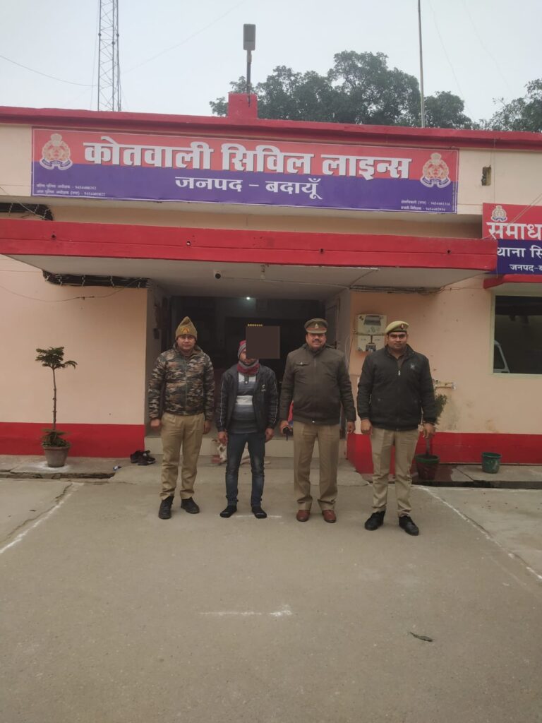 आलोक प्रियदर्शी वरिष्ठ पुलिस अधीक्षक जनपद बदायूं के निर्देशानुसार पुलिस अधीक्षक नगर बदायूं के कुशल निर्देशन व क्षेत्राधिकारी नगर के कुशल पर्यवेक्षण तथा प्रभारी निरीक्षक सिविल लाइन गौरव विश्नोई के नेतृत्व में थाना सिविल लाइन पुलिस द्वारा अभियुक्त मनीष यादव पुत्र राजीव यादव निवासी मोहल्ला नारायऩ गंज निकट रेलवे स्टेशन कस्बा व थाना उझानी जनपद बदायूं को गिरफ्तार किया गया ।