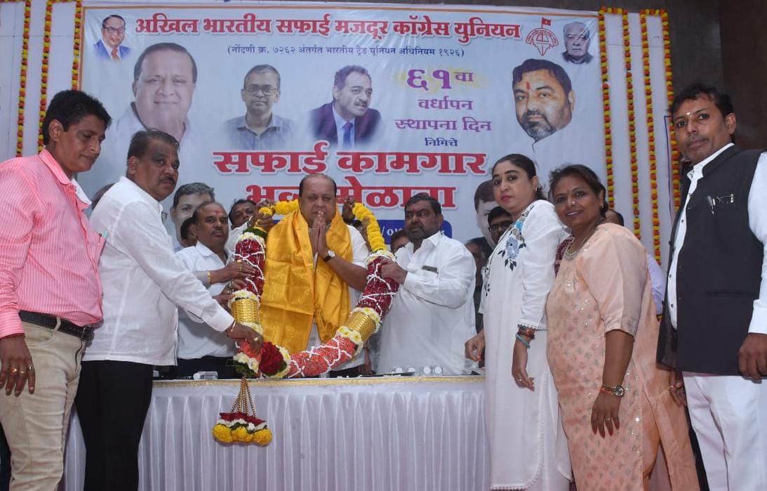 जितेंद्र सकपाळ , डॉ.भालचंद्र चिखलकर ( अधिक्षक विधकीय महाविद्यालय व. जी. टी.हॉस्पिटल) डॉ.विनायक सावर्डेकर उपस्थित थे। इस दौरान ६१ वा वर्धापन दिन” के अवसर पर बड़ा केक काटा गया।व प्रमुख मार्गदर्शक विशेष अतिथी महाराष्ट्र सरकार के मंत्री हसन मुश्रीफ के सौजन्य से कार्यक्रम का उद्घाटन किया गया । इस एतिहासिक वर्धापन दिवस पर महाराष्ट्र व मुंबई के सरकारी अस्पताल में सफाई कर्मचारियों के वारसदारों को जल्द से जल्द नौकरी, स्वयं के मालकी के घर का प्रश्न उसी तरह लाड पागे समिती की सिफारिशों को १२.८.१९१७५ से लागू करने की मांग की गई। बता दें कि ३० जुलाई को मंत्रालय में महाराष्ट्र के उपमुखमंत्री अजितदादा पवार (राष्ट्रीय अध्यक्ष, राष्ट्रवादी काँग्रेस पार्टी के नेतृत्व में सफाई कामगारों की ऐतिहासिक बैठक हुई थी। इस बैठक में महाराष्ट्र व मुंबई के सफाई कामगारों की प्रलंबीत समस्या को जल्द से जल्द सुलझाने की चर्चा हुई। वहीं मंत्री हसन मुश्रीफ ने वारिश दारों को नोकरी लाडपागे समिती के नियम अनुसार २५० सफाई कामगारों को भर्ती किए जाने का आश्वासन दिया । सम्मेलन को राष्ट्रीय उपाध्यक्ष डॉ.राजेंद्रराय शर्मा , व महाराष्ट्र अध्यक्ष घनश्याम डकाह ने भी संबोधित किया। ६१वे वर्धापन दिवस को सफल बनाने में मनिषाताई खाखडीया मुंबई सचिव , मगनभाई वाघेला ,.सुनील वंजारा ,मनीष वंजारा , .कुणाल सोलंकी राजेश टाकेकर, एस.लीना डिसोझा .चंद्रकांत सोलंकी, सुरेशभाई मारू, दिनकरभाई, एड.रवी गवळी, नवीनचंद्र मकवाना,जितुभाई रोझ, .विकी बडेल, रघुनाथ जाधव,जितेंद्र रेवर गिरधरभाई सापरिया, विलास दिवेकर, हिंमतभाई सोलंकी.जयसिंग परमार राहुल खुणे,नरेश परमार, जितेंद्र राठोड.अनिलभाई. परमार ने महत्वपूर्ण भूमिका निभाई।