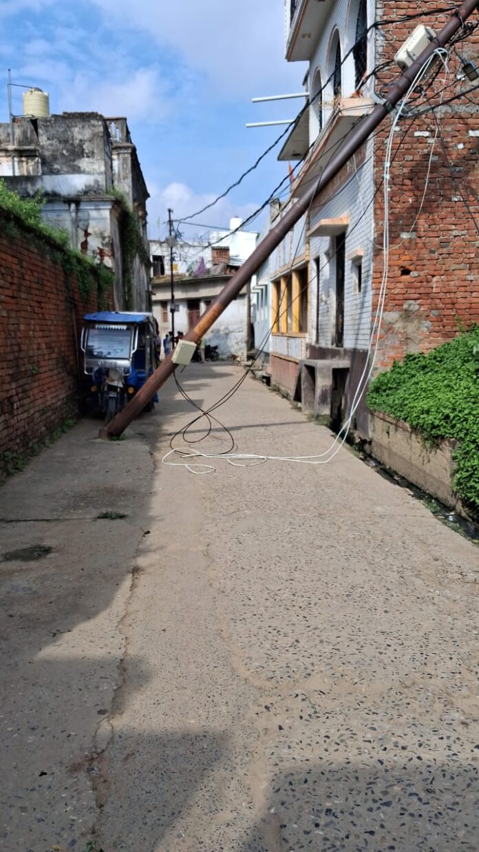 शनिवार की सुबह पटेल नगर के मुख्य सड़क के बगल मे खड़ा जर्जर विद्युत पोल सड़क पर गीर गया, दुर्घटना से बाल बाल बचे राहगीर।
