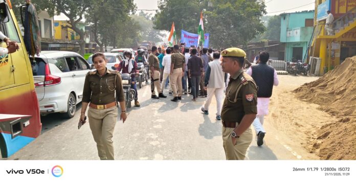 इस भव्य आयोजन को सुरक्षित और व्यवस्थित रखने के लिए कोपागंज थाना प्रभारी रवींद्रनाथ राय ,एसआई नीतीश चौधरी अपने दलबल के साथ पूरे समय मौके पर मौजूद रहे। उन्होंने पैदल मार्ग पर सुरक्षा व्यवस्था की गहन निगरानी करते हुए पुलिस टीम को आवश्यक दिशा-निर्देश दिए। उनकी तत्परता और पुलिस बल की सक्रियता के कारण पदयात्रा पूरी तरह शांतिपूर्ण, सुरक्षित और सफल रही। पूरे रास्ते पुलिसकर्मी ट्रैफिक नियंत्रण, भीड़ प्रबंधन और बच्चों की सुरक्षा में लगे रहे।