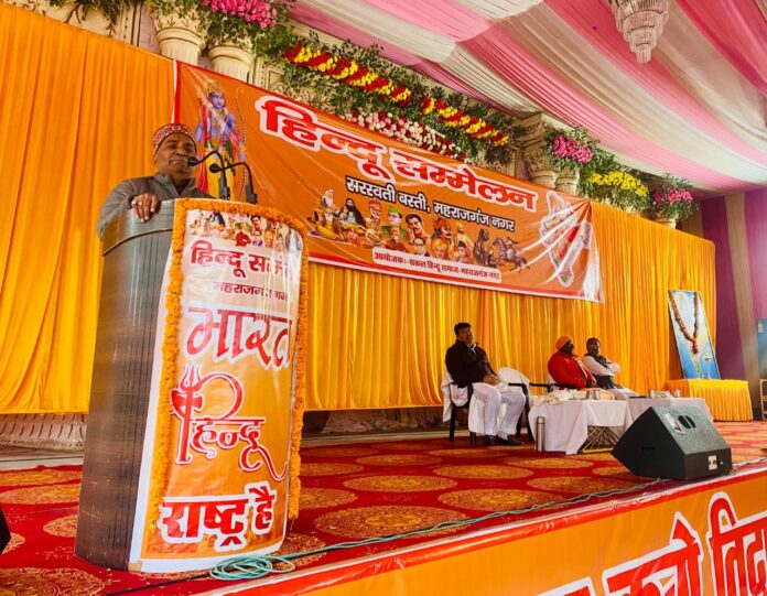 महराजगंज (राष्ट्र की परम्परा)। नगर के बालाजी लॉन में सोमवार को सकल हिन्दू समाज के तत्वावधान में आयोजित विराट हिन्दू सम्मेलन भव्यता, अनुशासन और सुव्यवस्थित आयोजन के साथ सफलतापूर्वक सम्पन्न हुआ। शीतलहर के बावजूद नगर एवं ग्रामीण अंचलों से बड़ी संख्या में श्रद्धालु, सामाजिक कार्यकर्ता, व्यापारी, शिक्षक और युवा वर्ग की सहभागिता ने सम्मेलन को ऐतिहासिक स्वरूप प्रदान किया। सम्पूर्ण परिसर भगवामय वातावरण, जयघोष और राष्ट्रभक्ति के नारों से गूंजता रहा।