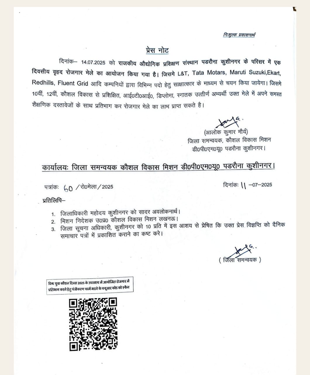 कुशीनगर (राष्ट्र की परम्परा)। युवाओं के लिए एक सुनहरा अवसर लेकर जिला कौशल विकास मिशन, डी०पी०एम०यू० पडरौना कुशीनगर द्वारा 14 जुलाई 2025 को राजकीय औद्योगिक प्रशिक्षण संस्थान (आईटीआई), पडरौना कुशीनगर के परिसर में एक दिवसीय वृहद रोजगार मेले का आयोजन किया जा रहा है। इस रोजगार मेले में L&T, Tata Motors, Maruti Suzuki, Ekart, Redhills, Fluent Grid जैसी देश की प्रतिष्ठित कंपनियाँ विभिन्न पदों पर भर्ती हेतु सीधे साक्षात्कार के माध्यम से चयन करेंगी।समन्वयक, कौशल विकास मिशन श्री आलोक कुमार मौर्य ने बताया कि इस मेले में 10वीं, 12वीं, आईटीआई, डिप्लोमा, स्नातक तथा कौशल विकास प्रशिक्षण प्राप्त अभ्यर्थी भाग ले सकते हैं। इच्छुक अभ्यर्थी अपने समस्त शैक्षणिक एवं पहचान पत्रों की मूल एवं छायाप्रति के साथ रोजगार मेले में प्रतिभाग कर सकते हैं।यह मेला युवाओं को रोजगार उपलब्ध कराने की दिशा में एक महत्वपूर्ण कदम साबित होगा।रोजगार मेला: दिनांक: 14 जुलाई 2025 स्थान: राजकीय औद्योगिक प्रशिक्षण संस्थान (आईटीआई), पडरौना, कुशीनगर,समय: प्रातः 10:00 बजे।अधिक जानकारी हेतु संपर्क करें:कार्यालय – कौशल विकास मिशन,डीपीएमयू, कुशीनगर