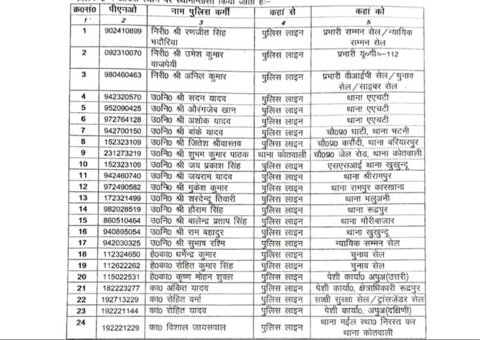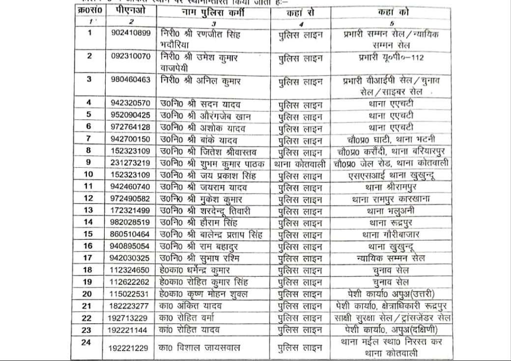 इसके अलावा उपनिरीक्षक जयराम यादव को थाना श्रीरामपुर, मुकेश कुमार को थाना रामपुर कारखाना, शरदेन्द्र तिवारी को थाना भलुअनी, हीराम सिंह को थाना रुद्रपुर, बालेन्द्र प्रताप सिंह को थाना गौरीबाजार और राम बहादुर यादव को थाना खुखुन्दू में नई जिम्मेदारी दी गई है।