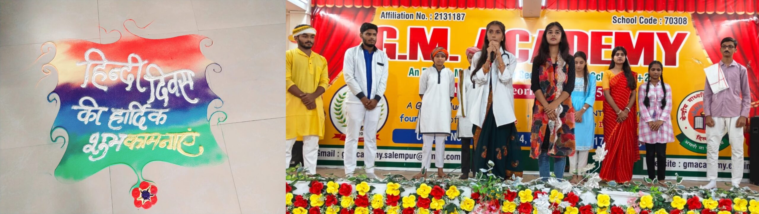 नगर के अग्रणी विद्यालय जी एम एकेडमी सीनियर सेकेंडरी स्कूल में हिंदी दिवस पर विभिन्न कार्यक्रम आयोजित किए गए। कार्यक्रम की शुरुआत विद्यालय के प्रधानाचार्य मोहन द्विवेदी द्वारा मां सरस्वती की प्रतिमा पर माल्यार्पण एवं दीप प्रज्ज्वलन से हुआ।कार्यक्रम में सर्वप्रथम कुंजल, अनन्या के सरस्वती वन्दना तत्पश्चात जिकरा, अनिष्का, तबस्सुम, जुनैद के सास बहू की लघु नाटिका की प्रस्तुति बहुत शानदार रही तो, आंचल, रिया, श्रद्धा, अरमान, श्वेता, रोशनी आदि के आनंदी बेन की शिक्षाप्रद नाटिका पर सबकी आंखें नम हो गईं। सबने इस कार्यक्रम के पात्र एवं उसके प्रदर्शन की भूरि भूरि प्रशंसा की।प्रतिष्ठा, अनिका, सिद्धिका, अक्षत,दिव्या, आशीष,अम्बर,स्वरित, सृष्टि, अनन्या, अदिति आदि के कार्यक्रमों की भी खूब सराहना हुई।