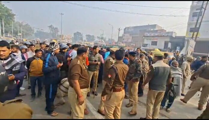 हादसे के बाद गुस्साए परिजनों और ग्रामीणों ने शव को सड़क पर रखकर बलिया मोड़ को जाम कर दिया। लोगों ने प्रशासन पर गंभीर आरोप लगाते हुए कहा कि सुबह-सुबह पुलिस की चेकिंग के कारण सड़क पर अफरा–तफरी का माहौल बन गया था। ट्रक चालक ने चेकिंग से बचने के लिए तेज रफ्तार में वाहन निकालने की कोशिश की, इसी दौरान युवक उसकी चपेट में आ गया और उसकी मौत हो गई।