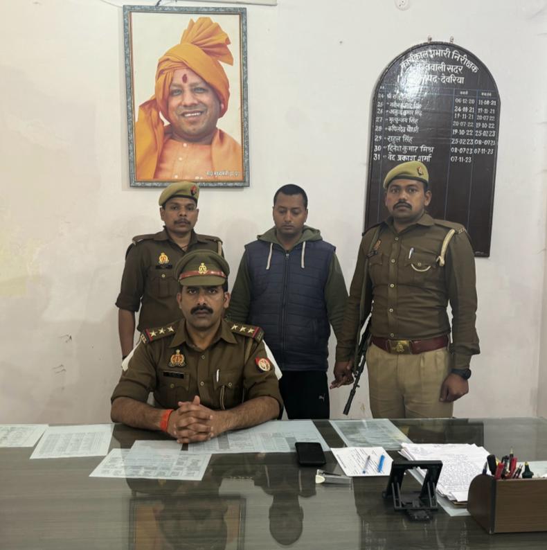 शनिवार 17.02.2024 को आरक्षी नागरिक पुलिस भर्ती परीक्षा 2023 के परीक्षा केन्द्र थाना कोतवाली क्षेत्रान्तर्गत एस0एस0बी0एल0 इंटर कालेज देवरिया गोरखपुर रोड देवरिया में, अजीत साहनी पुत्र रामलक्षन साहनी निवासी नगवा खास थाना एकौना जनपद देवरिया के स्थान पर चन्द्रभूषण सिंह पुत्र विनय सिंह निवासी कासिम बाजार (ब्रम्ह स्थान) थाना कासिम बाजार जनपद मुंगेर (बिहार) द्वारा परीक्षा दी जा रही थी, जिसे गिरफ्तार करते हुए वादी अशोक कुमार चौहान केन्द्र व्यवस्थापक एस0एस0बी0एल0 इण्टर कॉलेज देवरिया की तहरीर के आधार पर थाना कोतवाली में मु0अ0सं0-88/2024 धारा-419,420,467,468,471,120 भादंसं 4/10 परीक्षा अधिनियम 1982 अभियोग पंजीकृत करते हुए नियमानुसार कार्यवाही की जा रही है।