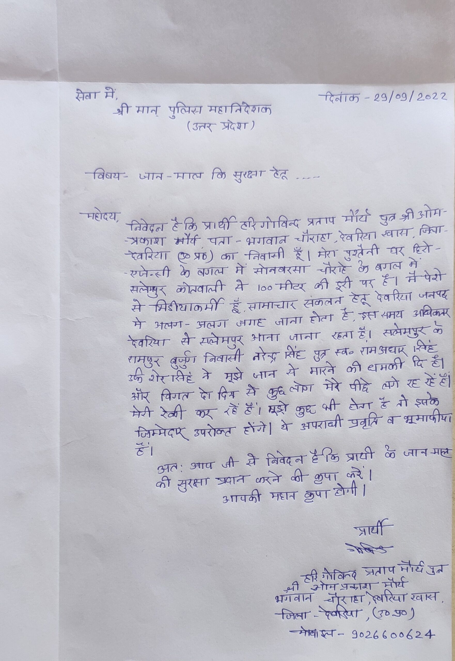 हरीगोविंद प्रताप मौर्य के कथनानुसार सलेमपुर तहसील के रामपुर बुजुर्ग ग्राम निवासी नागेंद्र सिंह पुत्र रामअधार सिंह उर्फ शेर सिंह ने उनके पीछे अपने कुछ अपराधि प्रवृति के लोगों को लगा रखा है ।जिसकी लिखित सूचना पत्रकार हरीगोविंद प्रताप मौर्य के द्वारा पुलिस अधीक्षक व सलेमपुर कोतवाली को दी जा चुकी है। अपने लिखित सूचना में उन्होंने बताया कि अगर उनके साथ कोई भी जानमाल का नुकसान होता है।