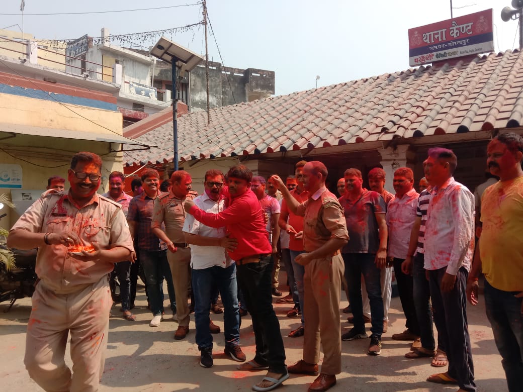 रंगों के महापर्व होली और धूलंडी का त्यौहार गोरखपुर जिले में बड़े ही धूमधाम से शांतिपूर्ण संपन्न कराने के बाद गुरुवार को पुलिस के जवानों ने होली का त्यौहार थाना परिसर में पुलिसकर्मियों ने एक दूसरे को रंग लगाकर होली की शुभकामनाएं देकर होली का जश्न मनाया।