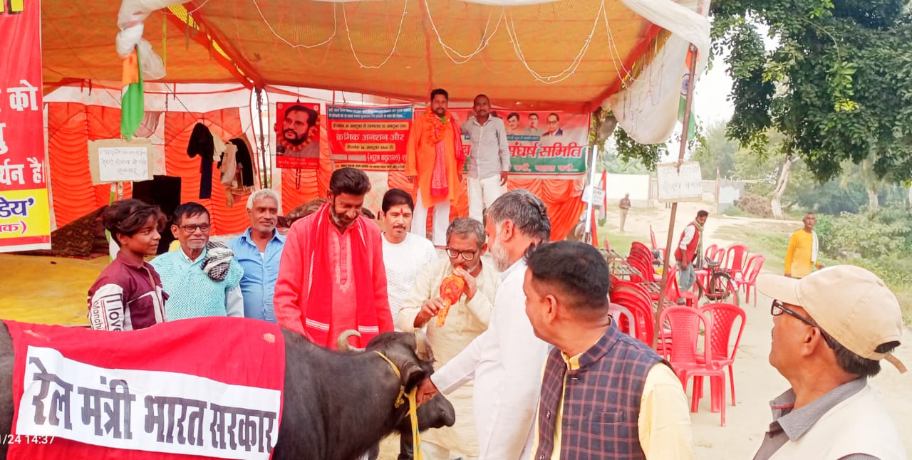 रेवती रेल आंदोलन के 36 वें दिन भैस के पीठ पर रेलमंत्री का स्टिकर लगा कर संयोजक लक्ष्मण पाण्डेय ने बीन बजा कर रविवार के दिन प्रदर्शन करते हुए रेवती रेलवे स्टेशन बहाल करने की मांग किया।
