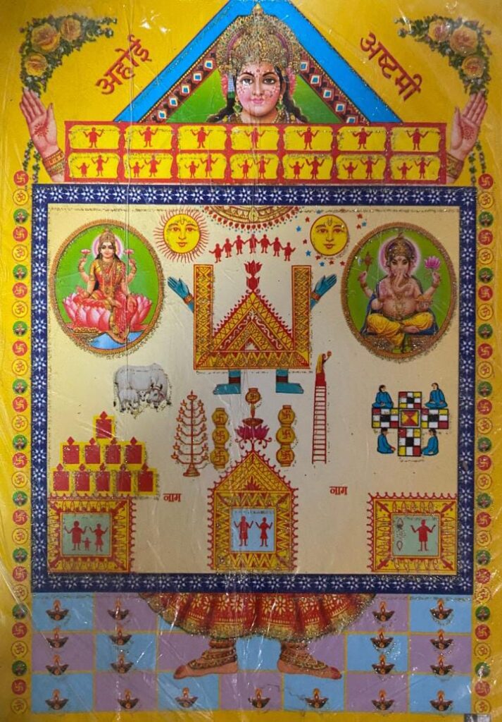 इस दिन महिलाएं दीवार पर अहोई माता का चित्र बनाती हैं, जिसमें सात पुत्रों और एक शावक का चित्रण किया जाता है। यह चित्र सात पीढ़ियों की समृद्धि और वंश की निरंतरता का प्रतीक माना जाता है।