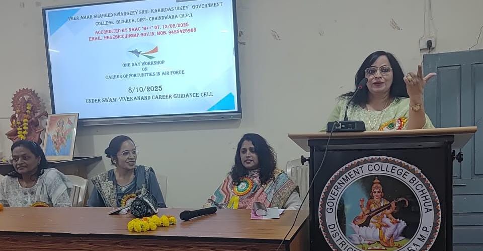 बिछुआ/मध्य प्रदेश (राष्ट्र की परम्परा)। वीर अमर शहीद स्वर्गीय कबीरदास उइके शासकीय महाविद्यालय, बिछुआ में बुधवार को “वायु सेना में कैरियर के अवसर” विषयक एक दिवसीय वर्कशॉप टेगौर हॉल में प्राचार्य के निर्देशन में संपन्न हुआ।