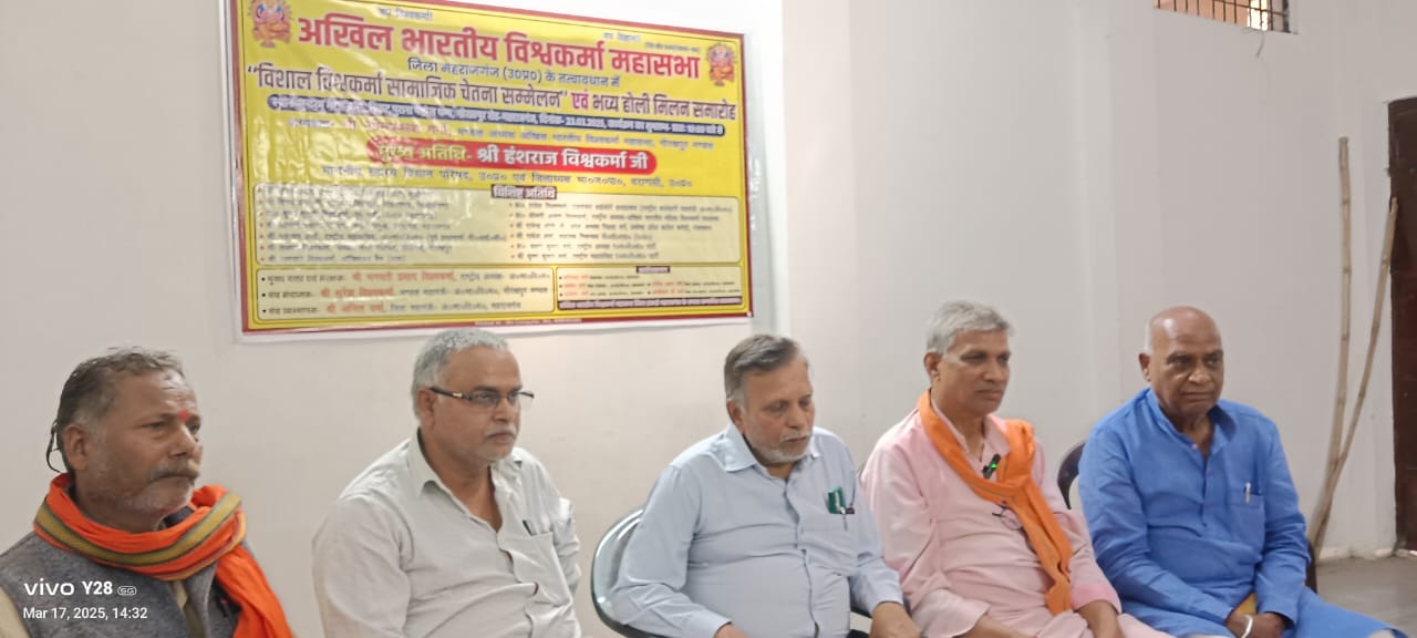 महराजगंज(राष्ट्र की परम्परा)। जिले में विश्वकर्मा समाज को एकजुट करने के लिए लोहर ,बढई,कसेरा, शिल्पकार व स्वर्णकार आदि समुदाय के लोगों ने अखिल भारतीय विश्वकर्मा महासभा के बैनर तले एक मैरेज हाल मे विशाल विश्वकर्मा सामाजिक चेतना बैठक व होली मिलन समारोह का आयोजन किया गया।