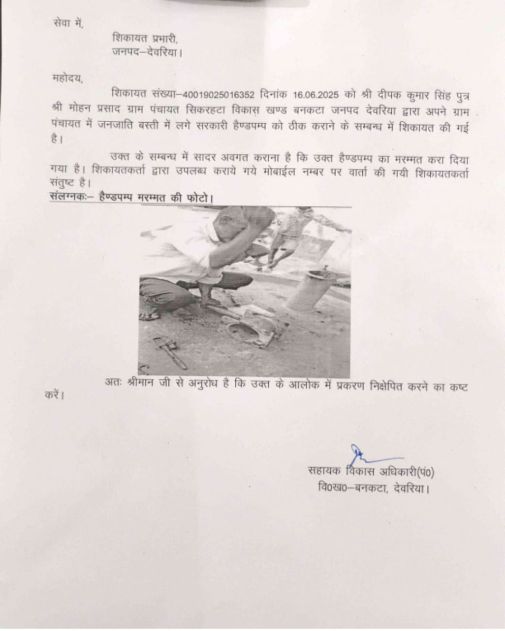 भाटपार रानी/देवरिया (राष्ट्र की परम्परा)। भाटपार रानी तहसील क्षेत्र के बनकटा विकास खण्ड क्षेत्र स्थित ग्राम पंचायत सिंकरहटा के निवासियों द्वारा शिकायत प्रभारी जनसुनवाई जनपद देवरिया को भेजे अपने शिकायती पत्र में सरकारी हैंडपंप के रिपेयर/रीबोरिंग के नाम पर रुपए गमन होने संबंधित दिए पत्र में आरोप लगाया है कि उनके ग्राम सभा में सभी सरकारी हैंडपंप खराब एवं जर्जर स्तिथि में हैं। जिसे रिपेयर/रीबोर के नाम लाखों रुपए उठाया तो गया है