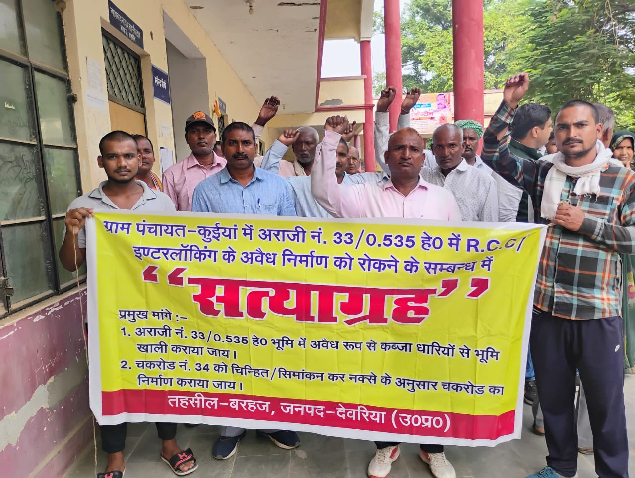 बरहज/देवरिया(राष्ट्र की परम्परा)। सोमवार को चौथे दिन भी जारी रहा बरहज तहसील में किसानों का अपनी भूमि को बचाने को लेकर। बताते चलें बरहज तहसील क्षेत्र के ग्राम पंचायत कुइयां में आराजी नं 33, में जबरजस्ती ग्राम प्रधान आर सी सी/इण्टरलॉकिंग कराना चाहते हैं। जिससे यहां पर विवाद की स्थिति उत्पन्न हो गया है। इसी नम्बर में भू माफियाओं ने 16 ढ़िस्मिल जमीन कब्जा कर लिए हैं। जहाँ उत्तर प्रदेश के मुख्यमंत्री योगी आदित्यनाथ ने प्रदेश में भूमि को खाली कराने को लेकर निर्देश जारी किए हैं। तथा प्रदेश के अधिकारी तंत्र को आदेश दिए हैं कि, किसी किसी भी आमजन की जमीन कोई भू माफिया कब्जा किया हो तो उसे तुरन्त कानूनी कार्यवाही कर खाली कराकर उसके मालिक को सौपा जाय किंतु ,उनका फरमान कागजो में सिमट जा रहा है। उक्त बातें सामाजिक कार्यकर्ता रामकिशोर चौहान और पीड़ित किसानों ने कहा। किसानों ने मांग किया कि चकरोड नम्बर 34 पर नक्शे के अनुसार सीमांकन कर रोड़ का निर्माण हो। यदि इस पर रोड़ का निर्माण नहीं हुआ तो आराजी नं 33 में जबरजस्ती भूमि पर आर सी सी, इण्टरलॉकिंग नहीं होने देंगे। 4 नवंबर सोमवार को संपूर्ण समाधान दिवस पर किसानों ने सत्याग्रह व धरना प्रदर्शन कर सत्याग्रहियों ने उपजिलाधिकारी अंगद यादव को अपना मांग पत्र सौपा। सभी पीड़ित किसानों ने कहा कि यदि मांगों को तहसील प्रशासन निस्तारित नही कराती है तो मुख्यमंत्री योगी आदित्यनाथ से मिलकर अपनी बात रखेंगे।धरना प्रदर्शन में मुनीब, महेश, नागेन्द्र, गनेश , रविन्द्र, सूरज, रामकिशुन, भीम कुमार भारती, सुरेन्द्र, दयालू, चंद्रमोहन, आदि लोग मौजूद रहे।