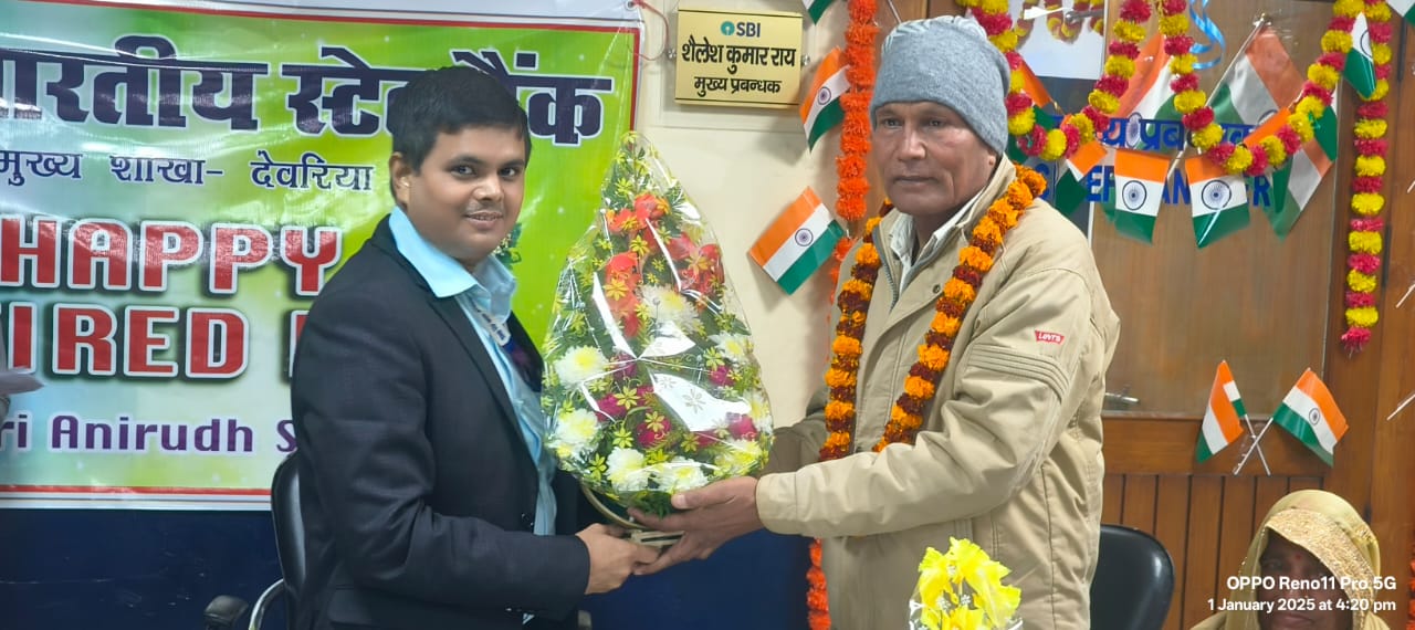 देवरिया (राष्ट्र की परम्परा) जनपद के स्टेट बैंक ऑफ़ इंडिया के मुख्य ब्रांच पर हेड गार्ड पद पर तैनात कर्मचारी अनिरुद्ध सिंह 31 दिसंबर 2024 को सेवानिवृत्ति हो गए। जिनकी विदाई कार्यक्रम 1 जनवरी 2025 को देवरिया के मुख्य शाखा राघव नगर से किया गया। इस कार्यक्रम के संयोजक मुख्य प्रबंधक शैलेंद्र राय व व्यवस्थापक राणा सिंह रहे ।इस अवसर सीएससी मैनेजर हरिंदर जी ,फील्ड मैनेजर मनीष जी ,हेड गार्ड सुरेश यादव के देखरेख में कार्यक्रम को संपन्न कराया गया।
