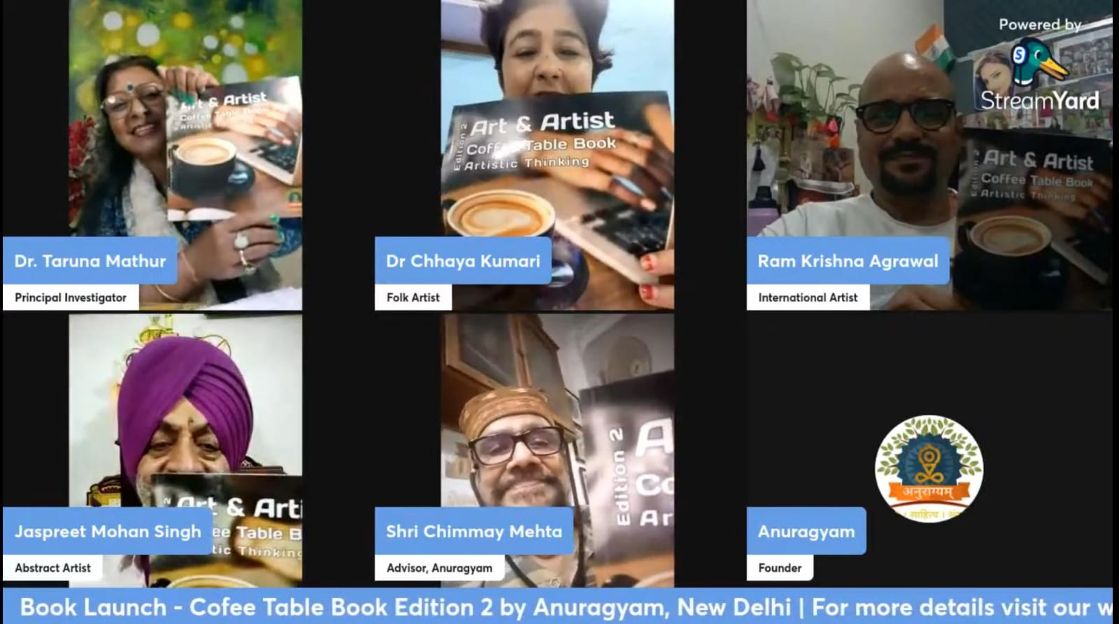 आर्टिस्टिक थिंकिंग टॉक सीरीज़ के हिस्से के रूप में, अनुराग्यम द्वारा 16 सितंबर, 2023 की शाम 7 बजे एक प्रतिष्ठित पुस्तक लॉन्च कार्यक्रम की मेजबानी की गई। जबकि पुस्तक का विमोचन यूट्यूब पर लाइव स्ट्रीमिंग कार्यक्रम के माध्यम से किया गया। अनुराग्यम संगठन इस उल्लेखनीय कॉफी टेबल बुक के आयोजन और प्रकाशन को लेकर उत्साहित हैं, आरोग्यम भारत के सभी कोनो से 25 कलाकारों के कार्यों को प्रदर्शित करता है। इस अवसर पर राष्ट्रीय पुरस्कार विजेता और राजस्थान ललित कला अकादमी, जयपुर के अध्यक्ष, डॉ. चिन्मय महेता ने कॉफी टेबल बुक संस्करण 2 के लॉन्चिंग कार्यक्रम में मुख्य अतिथि के रूप में शिरकत कर कार्यक्रम की शोभा बढ़ाई।