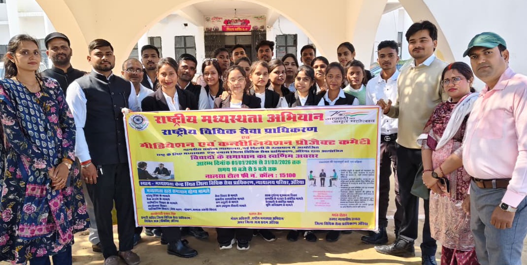 औरैया(राष्ट्र की परम्परा)जनपद औरैया में न्यायिक जागरूकता की दिशा में एक महत्वपूर्ण पहल करते हुए विकास भवन, ककोर परिसर में विधि छात्र-छात्राओं द्वारा राष्ट्र के लिए मध्यस्थता अभियान 2.0 औरैया के अंतर्गत एक प्रभावशाली नुक्कड़ नाटक का आयोजन किया गया। इस कार्यक्रम का उद्देश्य आमजनमानस को मध्यस्थता (मेडिएशन) और राष्ट्रीय लोक अदालत के माध्यम से विवादों के त्वरित एवं सौहार्दपूर्ण निस्तारण के लिए प्रेरित करना था।