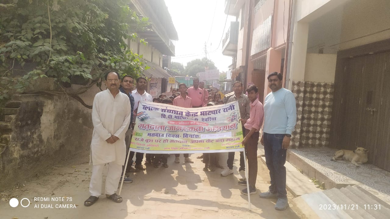 देवरिया (राष्ट्र की परम्परा)। खंड शिक्षा अधिकारी भाटपार रानी के निर्देशन में न्याय पंचायत बेलपार पंडित के विभिन्न विद्यालयों में मतदाता जागरूकता रैली निकाली गई तथा निबंध लेखन प्रतियोगिता का आयोजन किया गया।कंपोजिट विद्यालय भाटपार रानी में नगर पंचायत अध्यक्ष विजय गुप्ता द्वारा हरी झंडी दिखाकर रैली को रवाना किया गया जो नगर के विभिन्न मोहल्ले से निकलते हुए, अपने नारों से मतदाताओं को जागरूक करते हुए टाउन एरिया ऑफिस पर पहुंची । एकत्र लोगों को जागरूक करते हुए दीपक यादव द्वारा बताया गया की मतदाता सूची पुनरीक्षण कार्य के अंतर्गत चुनाव आयोग द्वारा अभियान चलाया जा रहा है जिसमे दिनांक 25 एवं 26 नवंबर को तथा 2 एवं 3 दिसंबर को विशेष अभियान चलाया जायेगा जिसमे 18 वर्ष के युवा मतदाता बन कर लोकतंत्र के इस सबसे बड़े त्यौहार में अपनी भागीदारी सुनिश्चित कर सकते है तथा एक स्वच्छ लोकतंत्र का निर्माण कर सकते है।प्राथमिक विद्यालय लाखोपर तथा बेलपर पंडित में भी इसी प्रकार से रैली निकाल कर लोगों को जागरूक किया गया, कृषक लघु माध्यमिक विद्यालय टीकमपार में निबंध लेखन प्रतियोगिता का आयोजन किया गया।