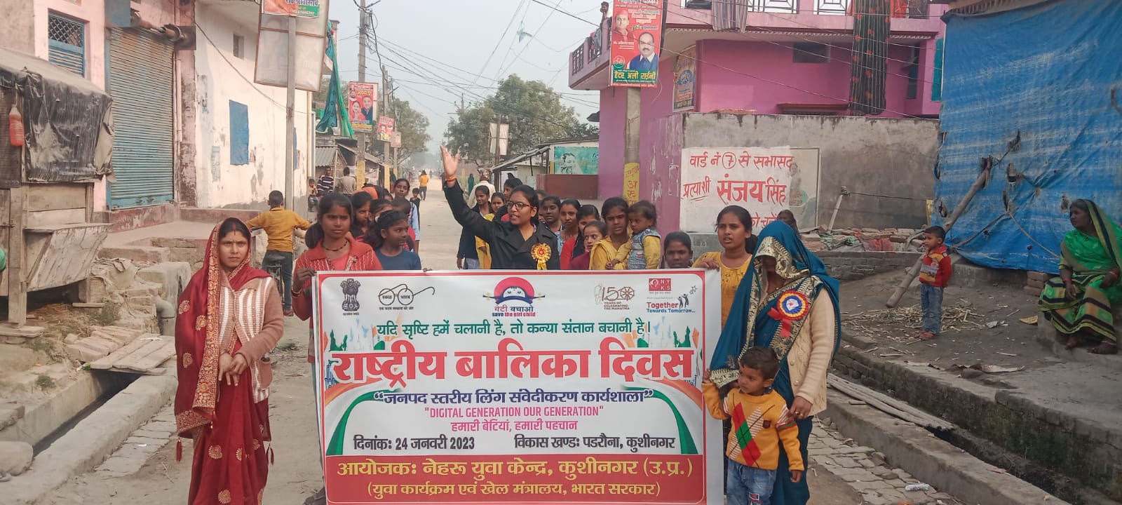 नेहरू युवा केन्द्र कुशीनगर , युवा कार्यक्रम एवं खेल मंत्रालय भारत सरकार के तत्वावधान में मंगलवार को विकासखंड पडरौना के ग्राम सभा जंगल बेलवा कटनवार में राष्ट्रीय बालिका दिवस के अवसर पर ग्रामीण युवतियों के साथ रैली में बेटी बचाओ , बेटी पढ़ाओ, पढ़ेगी बेटी बढ़ेगी बेटी, बेटी को अधिकार दो , बेटों जैसा प्यार दो, बेटी नही है कोई बोझ, तुम बदलो अपनी सोच जैसे स्लोगनो के माध्यम से जागरूकता का प्रसार किया गया । इसके साथ ही संगोष्ठी में युवतियों के बेहतर भविष्य के लिए सरकार द्वारा चलाई जा रही योजनाओं, की जानकारी देते हुए राष्ट्र निर्माण में अपनी सहभागिता दर्ज कराने की अपील के साथ ही उन्हें शसक्त बनने के लिए प्रेरित किया गया। जिसमे विकासखंड पडरौना के स्वयंसेवक भुवनेश्वर मौर्य, सौम्या जायसवाल, सपना गुप्ता, परितोष दुबे , सिलाई प्रशिक्षण केंद्र की प्रशिक्षिका श्रीमती बबिता देवी, नेहा जायसवाल एवं ग्राम सभा की जागरूक महिलाएं उपस्थित रही।