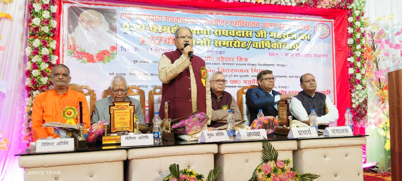 मुख्य अतिथि पूर्व विभागाध्यक्ष हिंदी विभाग गोरखपुर विश्वविद्यालय तथा अंतर्राष्ट्रीय हिन्दी विश्वविद्यालय वर्धा के पूर्व कुलपति प्रो.चितरंजन मिश्र ने कहा कि हम उनको इसलिए याद करते हैं कि, उन्होंने समाज को गढ़ने का दिव्य कार्य किया है। उनकी आंखों में ऐसी करुणा दिखाई देती थी कि दूसरे लोग भी उनके साथ सेवा कार्य में लग जाते हैं। आज जहां सत्ता के लिए संघर्ष की राजनीति चरम पर है वहीं बाबा सरकार छोड़कर समाज बनाने के कार्य में लग गये थे।1921 में महात्मा गांधी ने गोरखपुर में आयोजित एक सभा में बाबा के कंधे पर हाथ रखकर कहा था कि यदि राघवदास जैसे पांच सेवक मिल जाए तो स्वराज मिल जाएगा। उन्होंने गन्ना किसानों के ऊपर कोल्हू लगाए जाने के कारण राजनीति व विधानसभा तक का त्यागकर सेवा को प्रधानता दी।