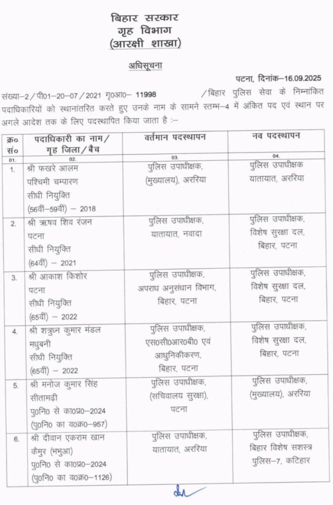 कहां हुआ तबादला अररिया मुख्यालय डीएसपी फखरे आलम को ट्रैफिक डीएसपी बनाया गया है।नवादा ट्रैफिक डीएसपी ऋषभ शिव रंजन को पटना के विशेष सुरक्षा दल (Special Security Group) में भेजा गया है। पटना सीआईडी डीएसपी आकाश किशोर और एससीआरबी डीएसपी शत्रुघ्न कुमार मंडल का भी स्थानांतरण विशेष सुरक्षा दल में किया गया है।सचिवालय सुरक्षा डीएसपी मनोज कुमार सिंह को अररिया मुख्यालय डीएसपी की जिम्मेदारी सौंपी गई है अररिया ट्रैफिक डीएसपी दीवान एकराम खान को कटिहार के बीसैप-7 (B-SAP) में तैनात किया गया है। पटना बीसैप-1 डीएसपी राजेश रंजन को सचिवालय सुरक्षा का कार्यभार दिया गया है।