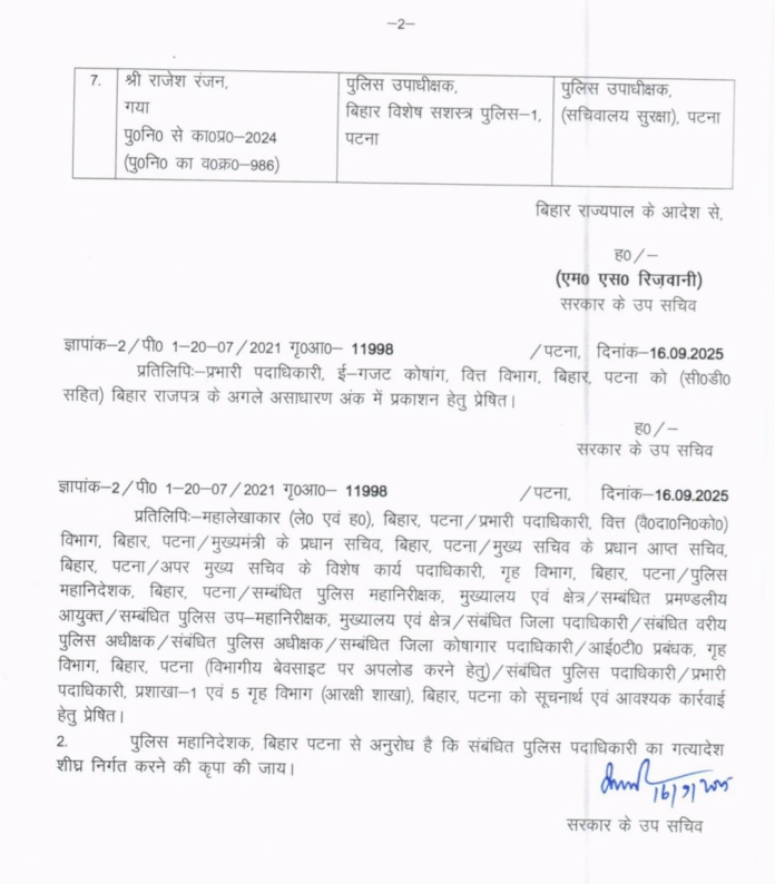 पटना (राष्ट्र की परम्परा डेस्क)दुर्गा पूजा से पहले बिहार सरकार ने सूबे में बड़े पैमाने पर पुलिस अधिकारियों के तबादले किए हैं। गृह विभाग द्वारा सोमवार को जारी अधिसूचना के मुताबिक सात डीएसपी का स्थानांतरण कर उनकी नई तैनाती की गई है। सरकार का कहना है कि आगामी पर्व-त्योहार और चुनाव को देखते हुए शांति व्यवस्था बनाए रखना तथा निष्पक्ष और भयमुक्त वातावरण सुनिश्चित करना प्राथमिकता है।