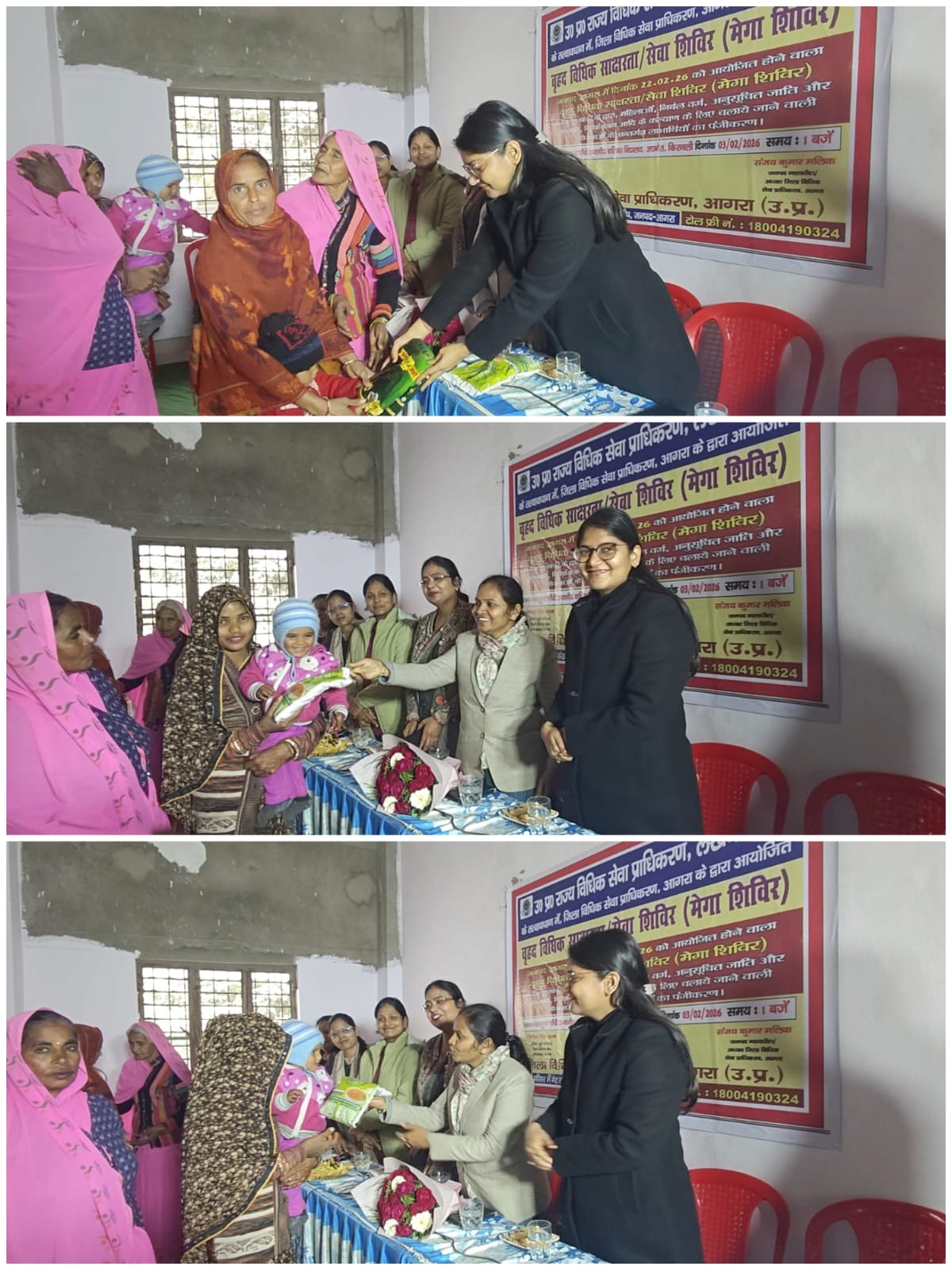 कार्यक्रम की अध्यक्षता सचिव (पूर्णकालिक) जिला विधिक सेवा प्राधिकरण, आगरा विनीता सिंह-1 ने की।शिविर में नायब तहसीलदार सुश्री शुभ्रा अवस्थी ने कन्या सुमंगला योजना, वोटर कार्ड संशोधन एवं तहसील स्तर पर संचालि जनकल्याणकारी योजनाओं की जानकारी दी। स्वास्थ्य विभाग की ओर से डॉ. सुष्मिता ने सर्वाइकल कैंसर, टीकाकरण पंजीकरण, स्वास्थ्य परीक्षण तथा आयुष्मान भारत योजना पर विस्तृत जानकारी साझा की।महिला एवं बाल विकास विभाग की प्रतिनिधि पूजा कुशवाहा ने गर्भवती महिलाओं को मिलने वाले पुष्टाहार एवं आर्थिक सहायता योजनाओं की जानकारी दी। खाद्य एवं आपूर्ति विभाग के देवेंद्र वर्मा ने राशन कार्ड और 60 वर्ष से अधिक आयु के नागरिकों के लिए आयुष्मान कार्ड पात्रता के बारे में बताया।शिविर के दौरान पात्र महिलाओं एवं बच्चों को पुष्टाहार सामग्री वितरित की गई। सचिव विनीता सिंह ने उपस्थित लोगों से योजनाओं का लाभ लेने हेतु जनसेवा केंद्र या संबंधित विभाग में पंजीकरण कराने की अपील की। साथ ही पराविधिक स्वयंसेवकों को मेगा शिविर के व्यापक प्रचार-प्रसार के निर्देश दिए गए।