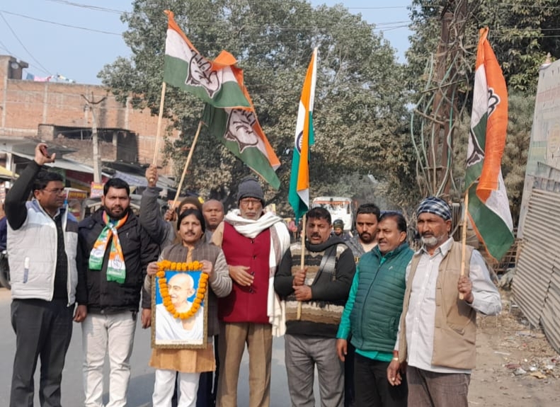 मंगलवार को भलुअनी ब्लाक स्थित गांधी चौक पर कांग्रेसियों ने राष्ट्रपिता महात्मा गांधी की शहादत को सिद्दत के साथ मनाया। यहां राष्ट्रपिता महात्मा गांधी के चित्र पर माल्यार्पण कर कांग्रेसियों ने श्रद्धांजलि अर्पित किया। उसके बाद गांधी जी के चित्र और राष्ट्र ध्वज लेकर भारत जोड़ो न्याय यात्रा के समर्थन में जुलूस निकाल कर, जोरदार नारेबाजी की। कांग्रेसियों ने गांधी चौक से मुख्य बाजार होते हुए बढ़पुरवां तक भारत जोड़ो न्याय यात्रा निकालकर कर राहुल गांधी के भारत जोड़ो न्याय यात्रा का बखान करते हुए समर्थन जताया।इस दौरान पीसीसी सदस्य मुजफ्फर हुसैन मंसूरी ने कहा कि जो काम देश को अंग्रेजी हुकूमत से निजात दिलाने के लिए राष्ट्रपिता महात्मा गांधी ने किया था, वही काम आज देश को अन्याय, अत्याचार, नफरत और मोदी सरकार की भेदभावपूर्ण नीति के खिलाफ राहुल गांधी कर रहे हैं। भाजपा सरकार राहुल गांधी के संघर्षों से इतनी भयभीत हो गयी है कि, भारत जोड़ो न्याय यात्रा में तरह – तरह से अड़ंगा लगा रही है। लेकिन इससे कांग्रेस पीछे हटने वाली नहीं है वह लोकतांत्रिक मूल्यों को बचाने के लिए कोई भी कुर्बानी देने के लिए तत्पर है। भोला तिवारी ने कहा कि मोदी सरकार में समाज का हर तबका परेशान हाल है। महंगाई और बेरोज़गारी से जनता त्रस्त है और मोदी सरकार लोकतंत्र को अस्थिर करने में व्यस्त है।इस दौरान मुख्य रूप से जिला सचिव भोला तिवारी, ब्लाक अध्यक्ष भलुअनी रामबहादुर सिंह, जिला सचिव मायाशंकर सिंह, ब्लाक अध्यक्ष बरहज मुजफ्फर हुसैन मंसूरी, गणेश गिरि,कृष्ण कुमार तिवारी, ब्यास दुबे,जितेन्द्र जायसवाल, श्याम सुंदर तिवारी,राजकुमार यादव, संजय प्रसाद,गोलू मिश्रा,आदि शामिल रहे।