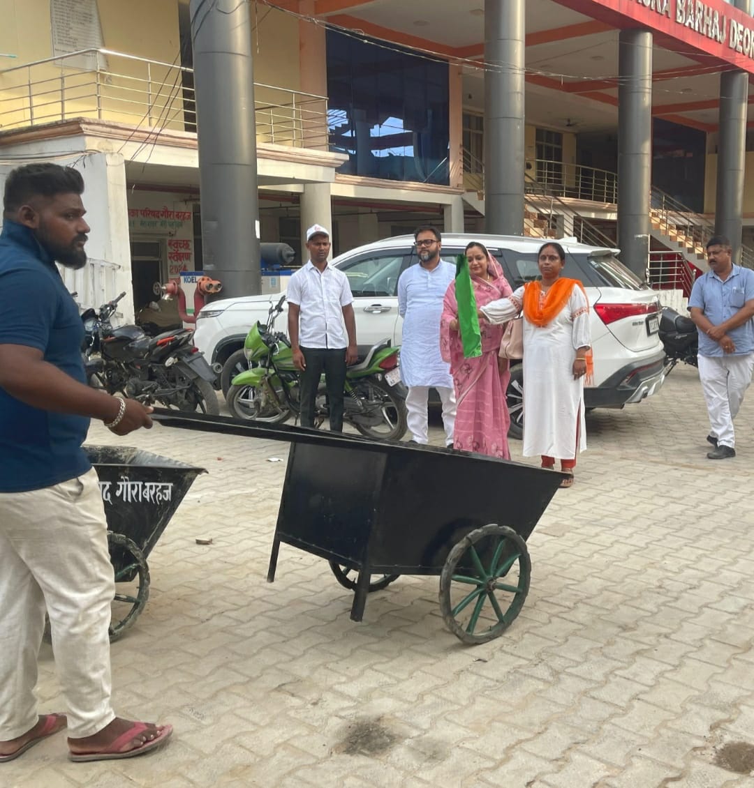 शासन के आदेशअनुसार मंगलवार को नगर पालिका परिषद गौरा बरहज में स्वच्छता ही सेवा, के आठवें दिन नगर पालिका अध्यक्ष श्वेता जायसवाल व अध्यक्ष प्रतिनिधि श्याम सुंदर जयसवाल एवं अधिशासी अधिकारी द्वारा हरि झंडी दिखाकर बाइक रैली निकाली गई, जिससे की लोगो को साफ सफाई के प्रति जागरूक किया जा सके। इसी क्रम में नगरपालिका अध्यक्ष व अधिशासी अधिकारी एवं अध्यक्ष प्रतिनिधि के द्वारा हाथ के ठेला को हरी झंडी दिखाकर रवाना किया गया। यह ठेला सकरी गलियों में कूड़ा उठाने में बहुत कारगर सिद्ध होत हैं।