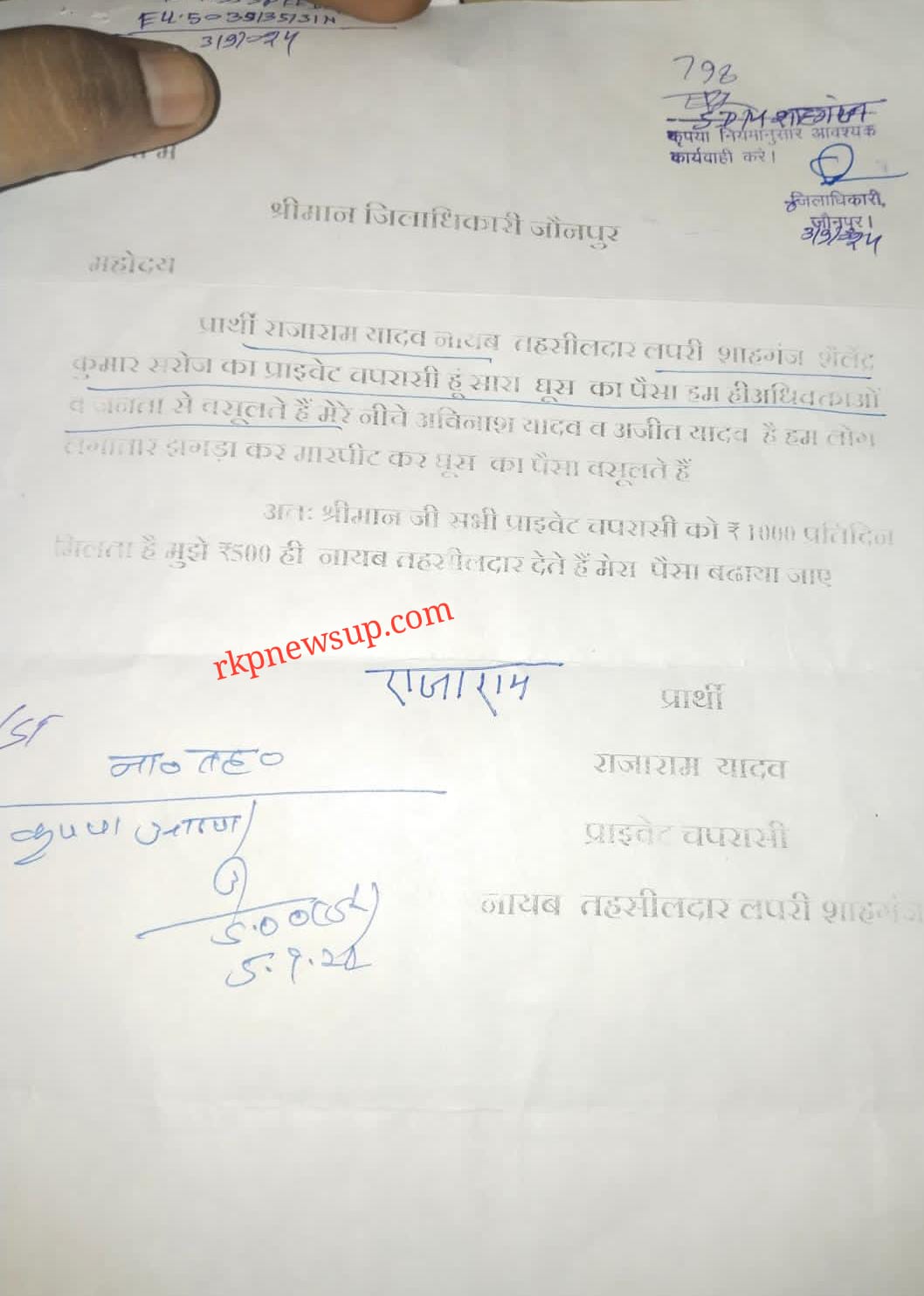 जौनपुर (राष्ट्र की परम्परा)l जिले के शाहगंज के नायब तहसीलदार शैलेन्द्र कुमार सरोज के कार्यालय के प्राइवेट चपरासी राजाराम यादव ने जिलाधिकारी को प्रार्थना पत्र देकर घूस की रकम से बराबर हिस्सा दिलाने की मांग की हैl