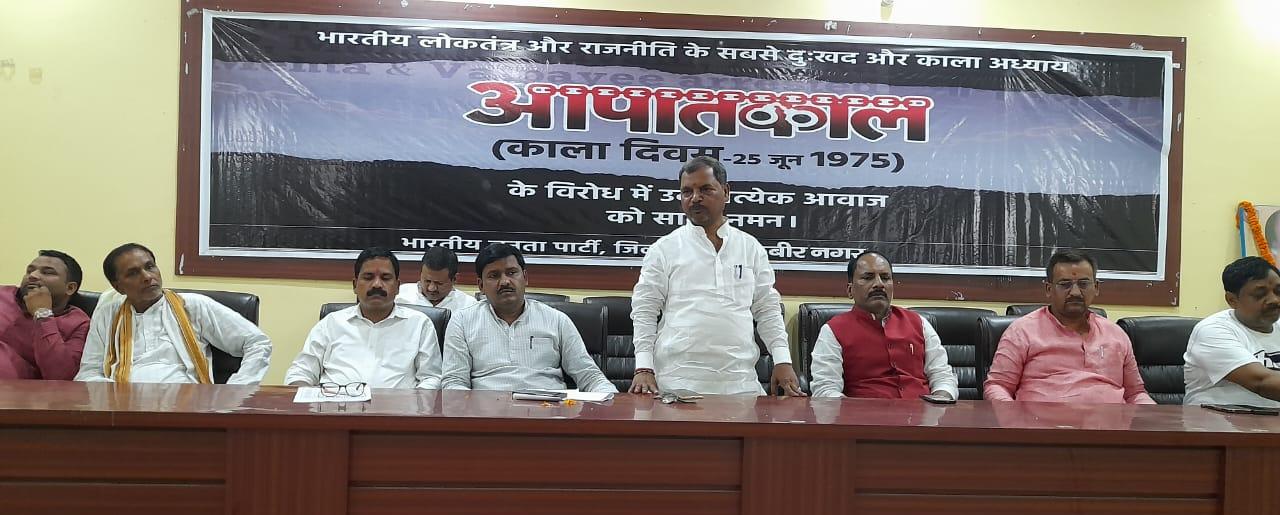 संत कबीर नगर (राष्ट्र की परम्परा)। भारतीय जनता पार्टी द्वारा जिले मे लोकतंत्र और राजनीति के सबसे दुखद और काले अध्याय आपातकाल के दौरान अपने जीवन को परवाह ना करते उस तानाशाही का विरोध करने वाले लोकतंत्र रक्षक सेनानियों का सम्मान करके आपातकाल दिवस मनाया। कार्यक्रम की अध्यक्षता करते हुए जिलाध्यक्ष जगदंबा प्रसाद श्रीवास्तव ने कहा कि आपातकाल के समय 25/26 जून 1975 से 21 मार्च 1977 तक का 21 महीने की अवधि में भारत में आपातकाल लगा था। तत्कालीन राष्ट्रपति फ़ख़रुद्दीन अली अहमद ने तत्कालीन भारतीय प्रधानमंत्री इन्दिरा गांधी के कहने पर भारतीय संविधान की अनुच्छेद 352 के अधीन आपातकाल की घोषणा कर दी। स्वतंत्र भारत के इतिहास में यह सबसे विवादास्पद और अलोकतांत्रिक काल था।आपातकाल में चुनाव स्थगित हो गए तथा नागरिक अधिकारों को समाप्त करके मनमानी की गई। इंदिरा गांधी के राजनीतिक विरोधियों को कैद कर लिया गया और प्रेस पर प्रतिबंधित लगा दिया गया।