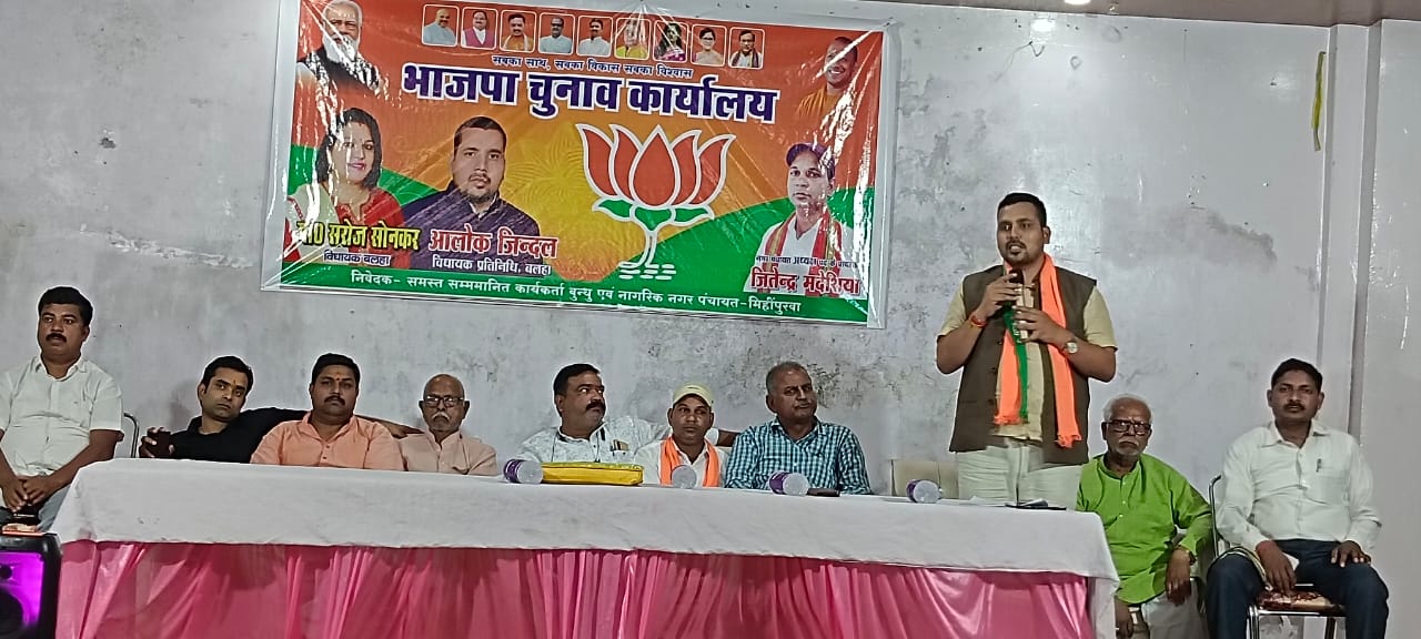 बहराइच (राष्ट्र की परम्परा) मोतीपुरनगर पंचायत चुनाव जीतने के लिए भारतीय जनता पार्टी ने कमर कस ली है । मंगलवार को मिहीपुरवा नगर में भाजपा नगर निकाय चुनाव कार्यालय का उद्घाटन हुआ जिसमें वक्ताओं ने नगर पंचायत चुनाव जीतने में पूरी ताकत झोंकते हुए कार्यकर्ताओं को चुनाव प्रचार में जुटने को कहा। कार्यक्रम संबोधन में विधायक प्रतिनिधि आलोक जिंदल अनुसूचित मोर्चा जिला अध्यक्ष शिव सागर गौतम पंकज गिरी सोमवर्धन पांडे राजेश गुप्ता योगेंद्र मौर्या राजेश जोशी सहित अन्य ने पार्टी के चुनाव जीतने के गुर सिखाए। वक्ताओं ने कहा कि आपसी मतभेद भूलकर भाजपा प्रत्याशी जितेंद्र मद्धेशिया को जिताएं। नगर पंचायत मिहींपुरवा में निकाय चुनाव कार्यालय का हुआ उद्घाटन समारोह में भाजपा प्रत्याशी जितेन्द्र मद्धेशिया और बलहा विधायक प्रतिनिधि आलोक जिंदल तथा मंच का संचालन तीरथराम लोधी ने किया, साथ में उपस्थित ओमप्रकाश श्रीवास्तव,रामआशीष सोनी, पंकज गिरि, शिवेंद्र प्रताप सिंह, रामादल मौर्या , सोमवधन पाण्डेय, राजेश गुप्ता, विमल पोरवाल, अतुल वर्मा, शिवसागर गौतम, सरोज रावत, अमित बाल्मिकी, संतोष श्रीवास्तव, रामहर्ष लोधी, रामनरेश पासवान, शुभ जिंदल,संजय सिंह, आदेश शुक्ला,विमल चौधरी, दिव्य प्रकाश मिश्र, सहित सैकड़ों की संख्या में लोग उपस्थित रहे।
