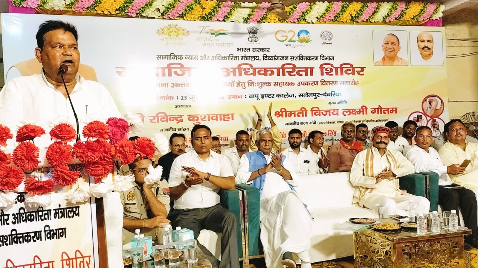 सलेमपुर/देवरिया(राष्ट्र की परम्परा) समाजिक न्याय और अधिकारिता मंत्रालय एवं दिव्यांगजन सशक्तिकरण विभाग द्वारा सामाजिक अधिकारिता शिविर का आयोजन बापू इण्टर कालेज सलेमपुर में किया गया। जिसमें एडिप योजना अन्तर्गत दिव्यांगजनो हेतु निशुल्क सहायक उपकरण वितरण किया गया।कार्यक्रम में 658 दिव्यांगों में 1104 सहायक उपकरण वितरण किये गए।जिसमे 260 ट्राईसाइकल,210 मोटराइज्ड ट्राईसाइकिल,वैसाखी एवं अन्य उपकरण शामिल था।कार्यक्रम का शुभारंभ सुनील यादव स्नेही ने लोकगीत “चंदन है इस देश की माटी”के साथ किया। सांसद रविंद्र कुशवाहा ने दिव्यांगजनो को सम्बोधित करते हुए कहा कि