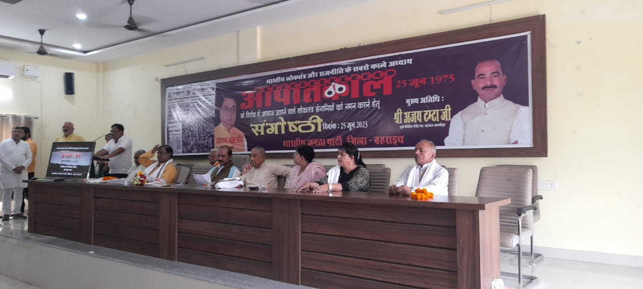 बहराइच (राष्ट्र की परम्परा) | भाजपा पार्टी जिला कार्यालय पर 25 जून 1975 को लगाए गए आपातकाल को काला दिवस के रूप में मनाया गया। इस कार्यक्रम में मुख्य अतिथि अल्मोड़ा के सांसद पूर्व केंद्रीय मंत्री अजय टम्टा की उपस्थिति रहे । कार्यक्रम की अध्यक्षता जिला अध्यक्ष श्यामकरन टेकड़ीवाल ने की मुख्य अतिथि लोकसभा 56 बहराइच के सांसद अक्षयवर लाल गौड़ उपस्थित रहे । मुख्य अतिथि अजय टम्टा ने अपने उद्बोधन में कहा कि लोकतंत्र सेनानियों से आग्रह है मेरा कि अपनी आने वाली पीढ़ियों को कांग्रेस के बर्बरता की कहानी सुनाना चाहिए । इंदिरा गांधी द्वारा किस तरह से छात्र यूनियन एवं छात्र नेताओं को बदलने के साथ-साथ भीषण यातनाएं भी दी गई । मीसा एवं डी0आई0आर0 जैसे संगीन धाराओं में बिना किसी अपराध के निरुद्ध कर दिया गया। आज लोकतंत्र सेनानियों का सम्मान करते हुए मैं अभिभूत हूं l अपने को धन्य मान रहा हूं l सांसद बहराइच ने स्वयं अपने ऊपर बीते हुए संस्मरण को कार्यकर्ताओं के बीच में रखते हुए कई घटनाओं का वर्णन किया l पुर्व मंत्री मुकुट बिहारी वर्मा ने कहा कि संगठन एवं पार्टी के आदेश के कारण हमने गिरफ्तारी तो नहीं दिया किंतु पूरे काल खंड भूमिगत रहते हुए आवश्यक सूचनाओ एवं कार्यक्रम की गतिविधियों को आगे बढ़ाने कार्यक्रम की गति विधियों को आगे बढ़ाने की सूचनाओ में महत्वपूर्ण भूमिका का निर्वहन किया। संविधान सभा सदस्य बलहा सरोज सोनकर ने भी इस अवसर पर अपने विचार व्यक्त किए।डॉ प्रज्ञा त्रिपाठी ने कार्यक्रम को संबोधित करते हुए लोकतंत्र सेनानियों का स्वागत किया ।लोकतंत्र सेनानी दिनेश जयसवाल एवं अजय सिंह विसेन ने 19 माह की झेली गई कारागार की यातनाओ का वर्णन अपने संबोधन में किया। कार्यक्रम का संचालन संयुक्त रूप से महामंत्री राघवेंद्र प्रताप सिंह एवं कार्यक्रम की संयोजक जिला मंत्री डॉ डिंपल जैन ने किया । मुख्य अतिथि सांसद अजय टम्टा, श्याम करण टेकड़ीवाल विधायकों एवं सांसद अक्षयवर लाल गोंड़ सदस्य विधान परिषद डॉक्टर प्रज्ञा त्रिपाठी ने समस्त लोकतंत्र सेनानियों को माल्यार्पण व अंग वस्त्र दे कर सम्मानित किया। सम्मानित किए गए लोक तन्त्र सेनानियो में सन्तराम वर्मा , राम अचल गुप्ता,विश्वनाथ सिंह , तीर्थ राम शुक्ल ,शिया राम पटेल ,धनीराम गुप्ता ,भुलई चौहान, राधे श्याम शुक्ल,ननकऊ प्रसाद पांडे, शेर बहादुर सिंह,किशोरी देवी, प्रेमा वती ,परशुराम तिवारी, को सम्मानित किया l कार्यक्रम में जिला उपाध्यक्ष रणविजय सिंह,राहुल राय,दीपक गुप्ता,उमाशंकर तिवारी,सुरेश गुप्ता,महामंत्री डॉ विपिन त्रिपाठी,नन्हे लाल लोधी,राघवेंद्र प्रताप सिंह,धीरेंद्र मोहन आर्य,मंत्री सुनील श्रीवास्तव,डिंपल जैन,रामनिवास जायसवाल,हेमा निगम,संजय राव,राजेश सिं