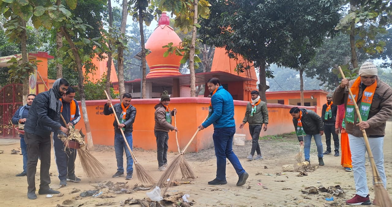 भारतीय जनता पार्टी द्वारा मंदिरों में चलाए जा रहे स्वच्छता अभियान के तहत पथरदेवा क्षेत्र के मछैला शिव मंदिर व हिरमती भवानी माता मंदिर परिसर में स्वच्छता का कार्यक्रम किया गया। भाजपा जिला स्वच्छता प्रकोष्ठ के जिला संयोजक कार्यक्रम के मंडल पथरदेवा प्रभारी जिलापंचायत सदस्य सुजीत प्रताप सिंह, मंडल अध्यक्ष रमेश सिंह,महामंत्री विवेक दत्त राय के नेतृत्व में सफाई अभियान चलाया गया। इस के साथ ही क्षेत्र के आधे दर्जन मंदिरो में भाजपा के बड़े दिग्गजों ने स्वचछता अभियान चलाया। कार्यक्रम के प्रभारी सुजीत प्रताप सिंह ने कहा कि अयोध्या में 22 जनवरी को श्री राम मंदिर में प्राण प्रतिष्ठा का कार्यक्रम है। इससे पहले देश में उस दिन उत्सव मनाने तैयारी की जा रही है। प्रधानमंत्री ने 14 जनवरी मकर संक्रांति के अवसर पर मंदिरों में स्वच्छता अभियान चलाने का आह्वान किया था। जिसके उपरांत भाजपा कार्यकर्ता हो या आम नागरिक हर व्यक्ति पूरी निष्ठा के साथ मोदी के इस अभियान का हिस्सा बन मंदिरो में स्वच्छता के लिए सफाई कार्य कर रहे।इस दौरान प्रेम चंद्र कुशवाहा,डा विंध्याचल मद्धेशिया,वशिष्ठ कुशवाहा, नवनीत मद्धेशिया ,युवामोर्चा के मंडल अध्यक्ष मृत्युंजय पांडेय के साथ ही बूथ अध्यक्ष विनोद सिंह,पुजारी विजय दास, बीडीसी सदस्य पंकज सिंह, विवेक श्रीवास्तव,नीतेश राव, मोहन चौहान, अमरजीत चौहान, जवाहिर सत्यप्रकाश राव, मोनू सिंह सहित भाजपाइयों ने मंदिर परिसर में साफ सफाई का कार्य किया।