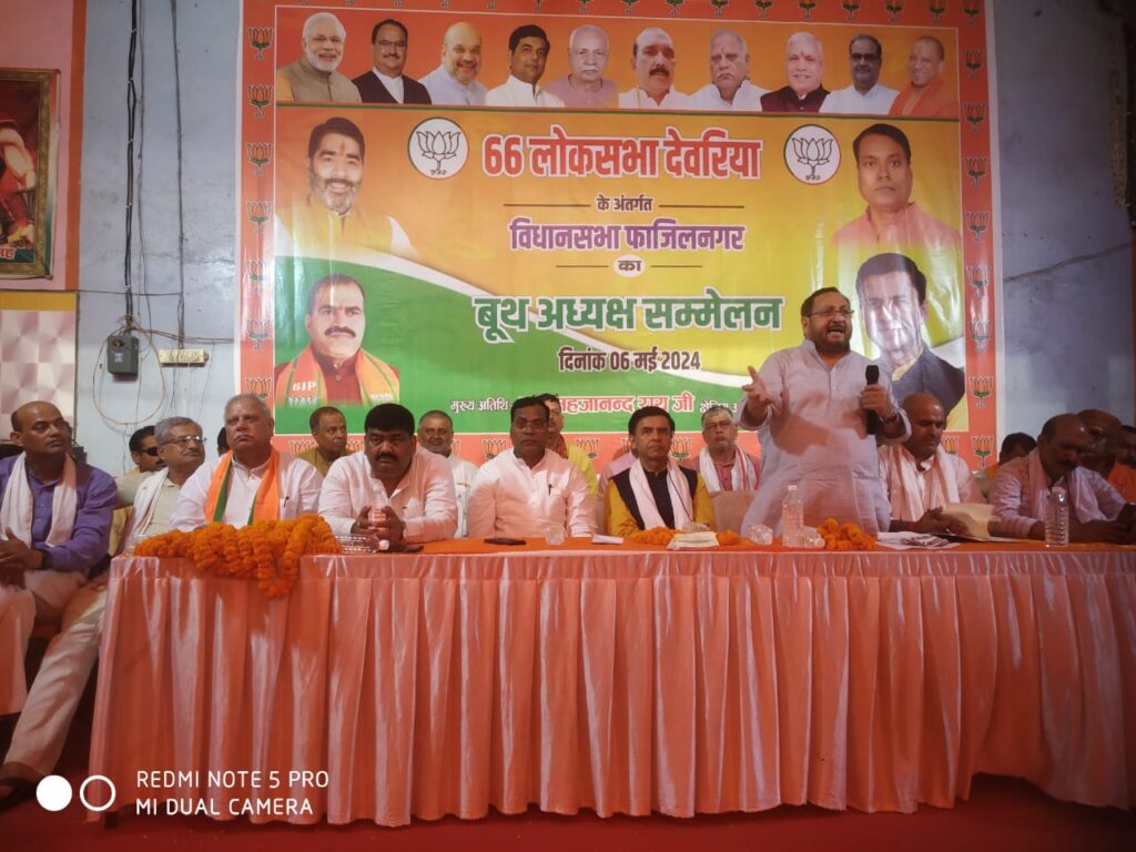 विधानपरिषद सदस्य रतनपाल सिंह नें कहा कि राममंदिर का निर्माण सांस्कृतिक आजादी का शंखनाद है। आज भारत एक शक्ति के रूप में उभर रहा है और विश्वगुरू बनने के लिए केंद्र में पुनः भाजपा की सरकार बहुत जरुरी है।लोकसभा प्रत्याशी शशांक मणि नें कहा कि वे लम्बे समय से देवरिया में काम कर रहें हैं,सबके प्रयास से सबका विकास हो सकता है।क्षेत्रीय विधायक सुरेन्द्र कुमार कुशवाहा ने कहा की हमारा लक्ष्य पोल के 66 प्रतिशत मत पाने का है यह तभी संभव हो सकेगा जब बुथ अध्यक्ष तथा पन्ना प्रमुख पूरे मनोयोग से लग जाय।।जिलाध्यक्ष दुर्गेश राय नें कहा कि बूथ प्रमुख व पन्ना प्रमुख सबसे संवाद करें। सम्मेलन को लोकसभा प्रभारी जेपी शाही, संयोजक सीपी सिंह, पूर्व जिलाध्यक्षगण डा. प्रेमचन्द मिश्रा, लल्लन मिश्रा,नगर पंचायत अध्यक्ष शत्रुमर्दन शाही, विजय राय,पूर्व प्रमुख प्रतिनिधि पशुपतिनाथ जायसवाल,मारकण्डेय दूबे,क्षेत्रीय कार्यालय मंत्री सत्येंद्र मिश्र,किसान मोर्चा के जिलाध्यक्ष अजय राय,क्षेत्रीय उपाध्यक्ष राधेश्याम पांडेय, पंकज पाण्डेय, डा.कन्हैया शर्मा, सत्यम शुक्ला आदि ने सम्बोधित किया। संचालन लोक सभा सह संयोजक दिवाकर मणि त्रिपाठी ने किया। इस दौरान डा.महेंद्र सिंह, डा.डीके गुप्ता,विजयशंकर तिवारी, चिरंजी सिंह, श्रीनिवास राय, मुकुल तिवारी, शेषनाथ मिश्र, राणाप्रताप मिश्र, दिग्विजय सिंह, कुलदीप उपाध्याय, राणाप्रताप सिंह, डा.शुभकर शुक्ला,अभिषेक तिवारी बिट्टू,अमलेश तिवारी, अनिल जायसवाल ,नीलेश उपाध्याय,आनंद उपाध्याय,अजय गिरी,विजय मिश्र,सरिता शर्मा,राजीव ऋषि तिवारी,दुर्गेश रायआदि उपस्थित थे।
