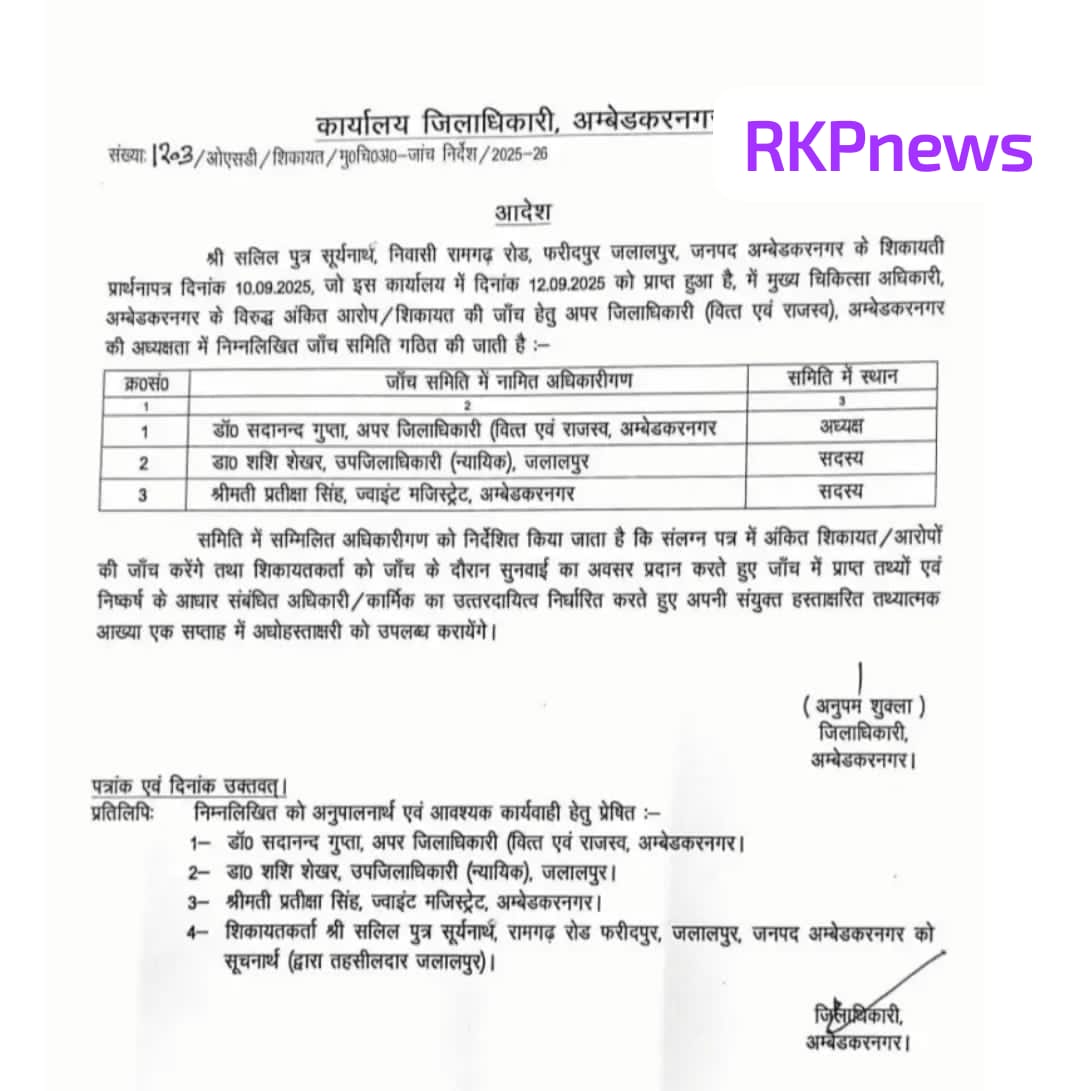 जानकारी के अनुसार, एडीएम डॉ. सदानंद गुप्ता को जांच टीम का अध्यक्ष बनाया गया है। उनके साथ सदर ज्वाइंट मजिस्ट्रेट प्रतीक्षा सिंह और जलालपुर एसडीएम शशि शेखर सिंह को सदस्य नियुक्त किया गया है। यह समिति आरोपों की गहराई से पड़ताल करेगी और तथ्यात्मक रिपोर्ट जिलाधिकारी को सौंपेगी। जिलाधिकारी के निर्देश पर आगे की कार्रवाई सुनिश्चित की जाएगी।