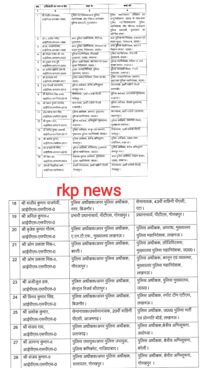 तबादलों की सूची इस प्रकार है – राजीव सभरवाल – डीजी पीटीसी मुरादाबाद,सतीश गणेश – एडीजी ट्रैफिक (लखनऊ वापसी),मोदक राजेश – आईजी जीआरपी,सत्यनारायण – एडीजी एसीओ,सुभाष चंद्र दुबे – आईजी महिला एवं बाल सुरक्षा,अनीस अंसारी – डीआईजी पीएसी लखनऊ,देव रंजन – डीआईजी स्थापना,डॉ. मिनाक्षी – सेनानायक वाराणसी,सर्वोदय चंद्र यादव – एसपी एसएसएफ,पंकज पांडेय – एसपी पीएसी मुख्यालय,महेंद्र पाल – सेनानायक SSF सहारनपुर,शुभम पटेल – एसपी तकनीकी सेवाएं,मनोज अवस्थी – सेनानायक 12वीं पीएसी फतेहपुर,अशोक कुमार – एसपी पावर कॉर्पोरेशन,चन्द्र कांत मीणा – एसपी इंटेलीजेंस कानपुर,रोहन झा – एएसपी साइबर क्राइम लखनऊ,निहारिका शर्मा – सेनानायक पीएसी गोरखपुर,संजीव बाजपेयी – सेनानायक पीएसी एटा,अनिल कुमार – प्रधानाचार्य पीटीएस गोरखपुर,ब्रजेश गौतम और ओमप्रकाश सिंह – डीजी मुख्यालय,ओमप्रकाश द्वितीय – डीजीपी मुख्यालय,अजीजुल हक – पुलिस मुख्यालय,विनय कुमार सिंह – एसपी एटीएस,अशोक कुमार – एसपी पुलिस भर्ती बोर्ड,संजय राय – एसपी इंटेलीजेंस अयोध्या,आनंद कुमार द्वितीय – एसपी इंटेलीजेंस बरेली,संजय कुमार द्वितीय – एसपी इंटेलीजेंस गोरखपुर