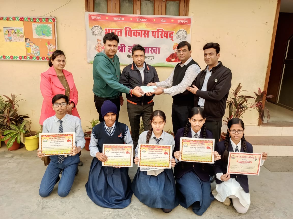 गोरखपुर(राष्ट्र की परम्परा) विजय चौक स्थित एस एस अकैडमी के प्रांगण में भारत विकास परिषद श्रीहरि शाखा के तत्वावधान में राष्ट्रीय समूह गान प्रतियोगिता में प्रतिभाग किए बच्चों को, मुख्य अतिथि डॉ मनोज जयसवाल एवं विशिष्ट अतिथि गोरक्ष प्रांत की महिला संयोजिका डॉ निशी अग्रवाल के द्वारा प्रशस्ति पत्र देकर सम्मानित किया गया.