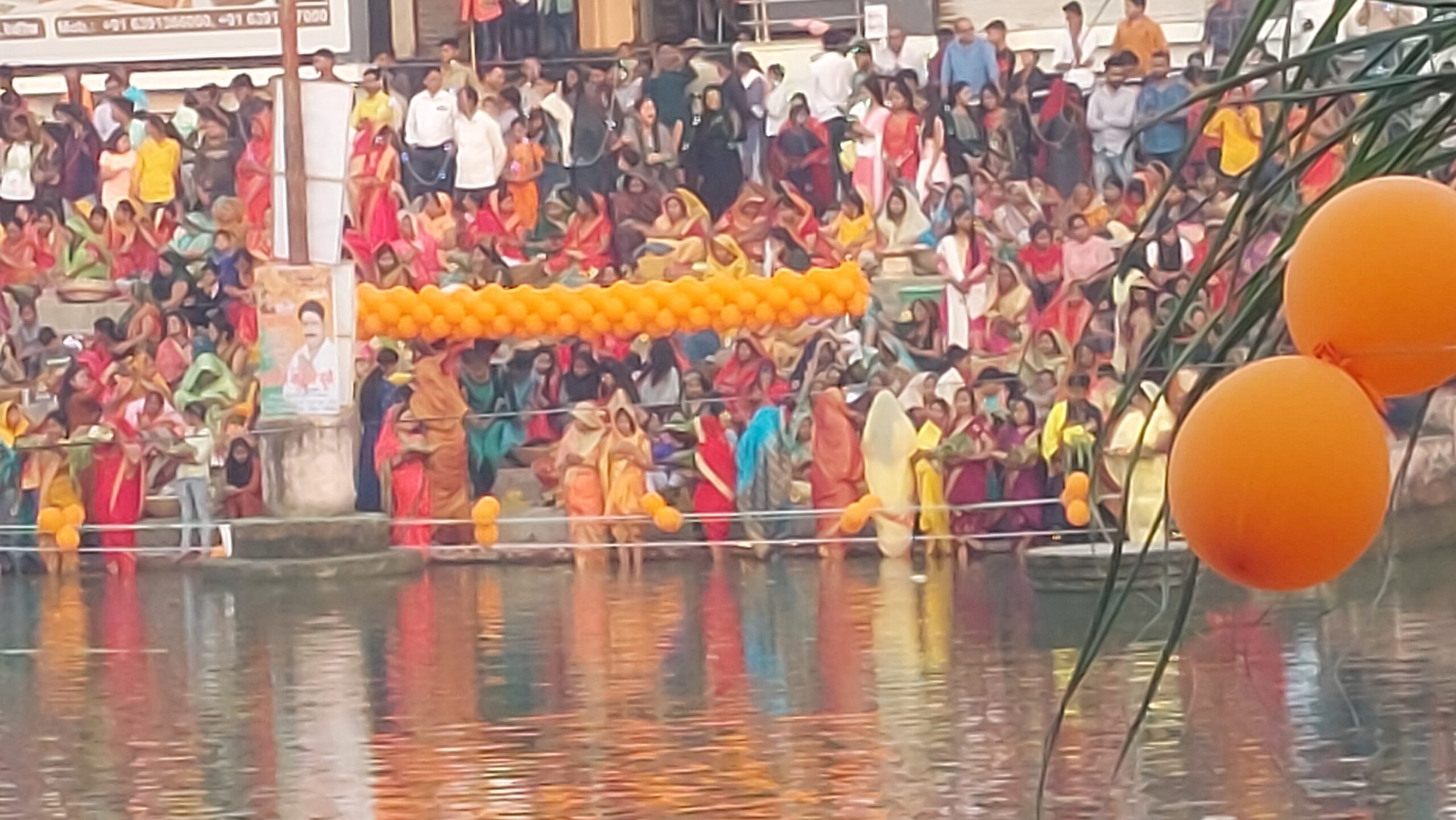 जैसे-जैसे अर्घ्य देने का समय निकट आया घाटों पर माता के जयकारे गुजने लगे। परिवार के पुरुष सदस्यों और पंडितों ने सूर्य देवता को अर्घ्य दिलाया। हनुमान मंदिर पोखरें और गायत्री मंदिर के निकट लच्छीराम पोखरा की छटा देखने योग्य थी। बड़ी संख्या में व्रती महिलाएं लच्छीराम पोखरें एवं अन्य पोखरों पर पहुंची। और सूर्यदेव को अर्घ्य देकर संतान की दीर्घायु के लिए प्रार्थना की।