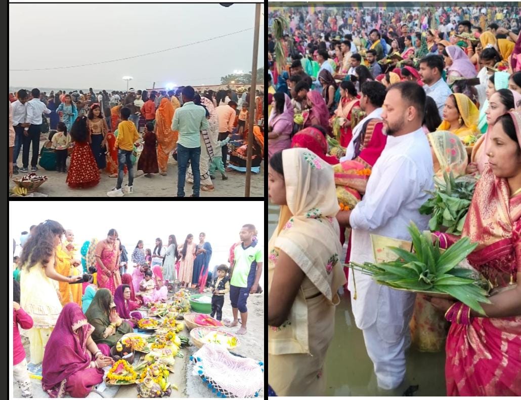 देवरिया जिले के मईल थाना क्षेत्र अंतर्गत भागलपुर के कालीचरण घाट पर महिलाओं ने अपने परिवार की खुशहाली और सलामती के लिए सूर्य देव को अर्घ देकर व्रत तोड़ा। इस अवसर पर घाट को बहुत ही सुंदर तरीके से सजाया गया था। हर वर्ष की बात थी इस वर्ष भी दूर दराज से आए हुए लोगों ने सूर्य देव की पूजा अर्चना की। व्रतियों को किसी प्रकार की असुविधा न हो इसके लिए खास व्यवस्था किया गया था। संजीत साहनी समाजसेवी और उनके सहयोगियों ने भागलपुर में मार्केट में कालीन बिछाया ताकि इस व्रत में माताएं बहने नंगे पांव घाट तक जाती हैं उनका कोई कष्ट ना हो। पूरे मार्केट की सफाई की ,अनेकों समाजसेवी छठ पर्व पर अपनी-अपनी सेवाओं में लग रहे, कोई व्रतियों को चाय पिला रहा था। कोई पानी पिला रहा था। कोई मिष्ठान दे रहा था। मौके पर मईल पुलिस एस एच ओ गोरखनाथ सरोज तहसीलदार रविंद्र मौर्य मय पुलिस फोर्स के साथ मुस्तैदी से तैनात दिखे। इस अवसर पर प्रधान प्रतिनिधि बृजभूषण यादव, पूर्व प्रधान अनिल जायसवाल ,गुलाबचंद यादव, शिव शंकर जायसवाल शत्रुघ्न मौर्य,अजय सिंह, शंभू जयसवाल, ओमप्रकाश पांडे, अजय जायसवाल विपिन जायसवाल इंद्रदेव साहनी हरिशंकर सोनू साहनी मोनू साहनी संजीव साहनी इत्यादि लोग मौजूद रहे।