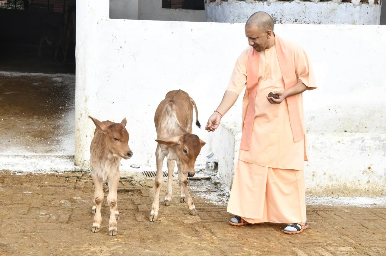 मुख्यमंत्री योगी आदित्यनाथ ने गोरखनाथ मंदिर में गायों को खिलाया गुड़