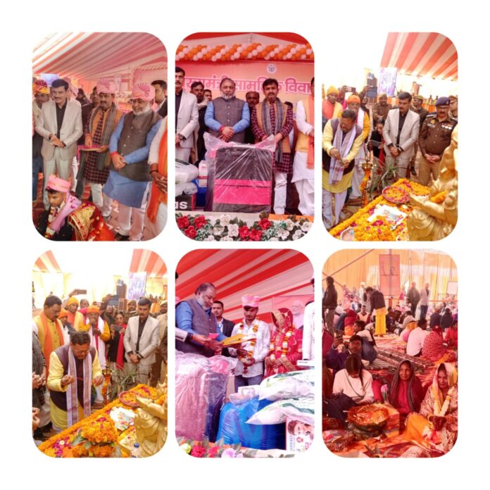 शनिवार को राजकीय पॉलिटेक्निक कॉलेज मैदान में मुख्यमंत्री सामूहिक विवाह समारोह का भव्य आयोजन किया गया, जिसमें जिले के विभिन्न विकास खंडों से आए 227 जोड़ों का विवाह संपन्न कराया गया। कार्यक्रम के मुख्य अतिथि प्रदेश के परिवहन मंत्री दयाशंकर सिंह रहे। उन्होंने भगवान गणेश की प्रतिमा पर माल्यार्पण एवं मंत्रोच्चार के साथ समारोह का शुभारंभ किया। आयोजन में 225 जोड़ों ने हिंदू रीति-रिवाज से सात फेरे लिए, जबकि 2 मुस्लिम जोड़ों का निकाह कराया गया। सभी जोड़ों का बायोमेट्रिक सत्यापन भी किया गया।बमुख्य अतिथि दयाशंकर सिंह ने कहा कि कन्यादान को सबसे बड़ा दान माना गया है और मुख्यमंत्री योगी आदित्यनाथ द्वारा शुरू की गई यह योजना आर्थिक रूप से कमजोर परिवारों के लिए बड़ा सहारा है। उन्होंने कहा कि बेटियों के विवाह की चिंता हर माता-पिता को होती है, ऐसे में सरकार उनके साथ मजबूती से खड़ी है। उन्होंने जानकारी दी कि पहले इस योजना के तहत ₹50 हजार की सहायता दी जाती थी, जिसे अब बढ़ाकर ₹1 लाख कर दिया गया है। उन्होंने कहा, “अब ये बेटियां सिर्फ अपने परिवार की ही नहीं, बल्कि सरकार की भी जिम्मेदारी हैं।” उन्होंने वर पक्ष से बेटियों को सम्मान देने की अपील करते हुए नवविवाहित जोड़ों को उज्ज्वल भविष्य का आशीर्वाद दिया।