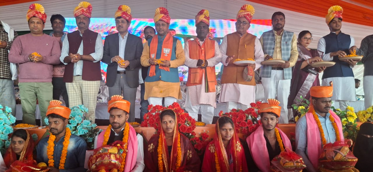कार्यक्रम का शुभारंभ मुख्य अतिथि क्षेत्रीय विधायक प्रतिनिधि धर्मवीर पटेल एवं विशिष्ट अतिथि नगरपालिका अध्यक्षा शकुंतला जायसवाल द्वारा दीप प्रज्वलन कर किया गया। इसके पश्चात सामूहिक रूप से विवाह की रस्में प्रारंभ हुईं। प्रत्येक वेदी पर पारंपरिक परिधान में सजे दूल्हों की द्वार पूजा की गई, जबकि सजी-धजी दुल्हनों को विधि-विधान के साथ वेदी तक लाकर सभी संस्कार संपन्न कराए गए।