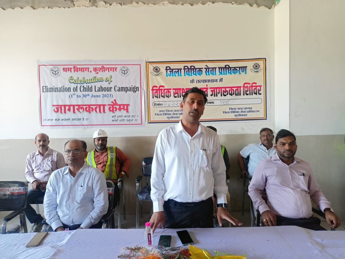 अपर जिला जज/सचिव जिला विधिक सेवा प्राधिकरण कुशीनगर रवि कान्त यादव ने बताया कि गुरुवार को जिला विधिक सेवा प्राधिकरण, कुशीनगर के तत्वावधान में बालश्रम उन्मूलन जागरूकता शिविर का आयोजन नव निर्मित मेडिकल कालेज, रामपुर हरका, में श्रमिकों के मध्य रवि कान्त यादव, अपर जिला जज/सचिव, जिला विधिक सेवा प्राधिकरण, कुशीनगर की अध्यक्षता में किया गया। शिविर का संचालन श्रम प्रवर्तन अधिकारी मनीष कुमार सिंह द्वारा किया गया। शिविर को संबोधित करते हुए सचिव, जिला विधिक सेवा प्राधिकरण, कुशीनगर द्वारा उपस्थित मजदूरों को जागरूक करते हुए बताया गया कि बाल श्रम एक अपराध है। 14 वर्ष से कम आयु के बच्चों से किसी भी प्रकार का मजदूरी कराने पर मजदूरी कराने वाले के ऊपर एफआईआर दर्ज हो सकता है एवं जुर्माना भी हो सकता है। 14 वर्ष तक के बच्चों को सरकार ने निःशुल्क शिक्षा की व्यवस्था की है। इसलिए बच्चे स्कूल पढ़ने जाये एवं बड़े अपने काम पर जाये। 15 से 18 वर्ष तक की आयु के बच्चों से हल्का-फुल्का काम कराया जा सकता है, कोई जोखिम वाला काम नहीं लिया जा सकता।