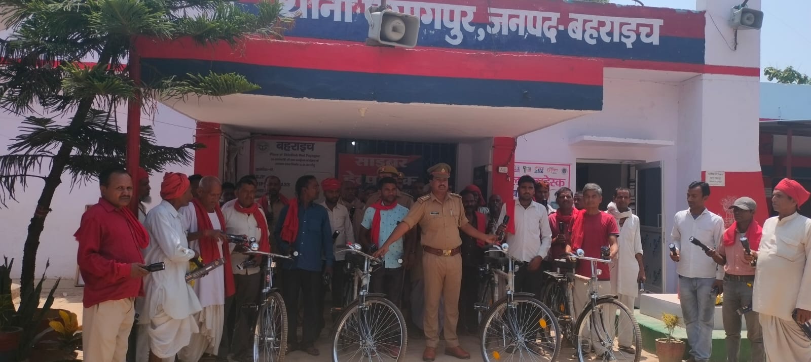 बहराइच (राष्ट्र की परम्परा) थाना पयागपुर के कार्यरत चौकीदारों को पुलिस अधीक्षक के सौजन्य से चौकीदारों को अपने क्षेत्र में भ्रमण करने के लिए साइकिल व टॉर्च दिया गया,यह सुविधा समय-समय पर विभाग द्वारा चौकीदारों को साइकिल, टॉर्च ,चादर आदि आवश्यक वस्तुएं पुलिस अधीक्षक बहराइच द्वारा चौकीदारों को प्रदान की जाती है। पुलिस अधीक्षक बहराइच के सौजन्य से थाना अध्यक्ष पयागपुर श्यामदेव चौधरी द्वारा बजरंगी लाल यादव निवासी पिपरा पदारथ, जगजीवन लाल निवासी परसिया पंडित, संतोष कुमार निवासी अकरौरा,अश्वनी कुमार निवासी बसनेरा को साइकिल प्रदान की गई और थाने पर तैनात सभी चौकीदारों को टॉर्च मुहैया कराया गया जिससे चौकीदारों को क्षेत्र में आने जाने में कोई दिक्कत ना हो।थानाध्यक्ष पयागपुर श्याम देव ने बताया की शिफ्ट वाइज साईकल प्रदान की जाती है कुछ लोगों को पहले सायकिल मिल चुकी थी ये लोग शेष रह गए थे आज इन लोगों को भी सायकिल आने जाने और गस्त करने के लिए प्रदान की गई है साथ ही साथ सभी चौकीदार को टॉर्च प्रदान की गई है।साईकिल व टार्च पाकर चौकीदारों ने खुशी जताया।इस अवसर पर थानाध्यक्ष पयागपुर श्याम देव,मुख्य आरक्षी यस यन शुक्ला,विकास मिश्रा,दशरथ लाल चौकीदार सहित सभी चौकीदार मौजूद रहे।