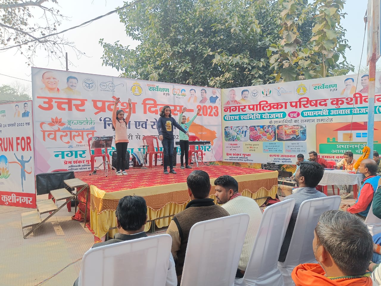 उत्तर प्रदेश दिवस के अवसर पर मंगलवार को नगर पालिका परिषद कुशीनगर द्वारा, स्वच्छ विरासत कार्यक्रम का समापन तथा उत्तर प्रदेश दिवस 2023 का आयोजन बुद्धा घाट कुशीनगर पर किया गया, जिसके अंतर्गत विभिन्न कार्यक्रम आयोजित किए गए। ग्रुप नृत्य,एकल नृत्य और फरवाही लोक नृत्य तथा अन्य सांस्कृतिक कार्यक्रम आयोजित हुए एवं पीएम स्व निधि योजना तथा पीएम आवास योजना 5/5 लाभार्थियों को भी प्रमाण पत्र वितरित किया गया। कार्यक्रम में अधिशासी अधिकारी कसया प्रेम शंकर गुप्ता द्वारा प्रतिभागियों को प्रशस्ति पत्र देकर के सम्मानित किया गया, साथ ही स्वच्छ विरासत अभियान में अच्छे कार्य करने वाले सफाई मित्रों को भी सम्मानित किया गया।