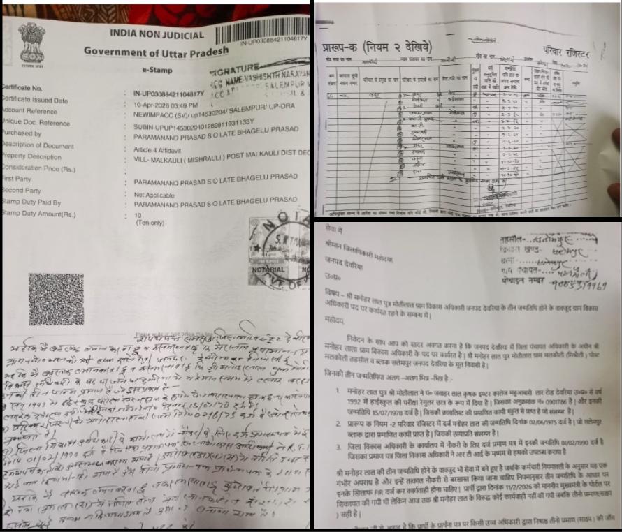 सलेमपुर/देवरिया(राष्ट्र की परम्परा)। कांग्रेस के जिला सचिव परमानन्द प्रसाद ने बृहस्पतिवार को जिलाधिकारी दिव्या मित्तल को शिकायती पत्र सौंप कर बरहज विकास खण्ड में तैनात ग्राम विकास अधिकारी मनोहर लाल पुत्र मोतीलाल निवासी मिश्रौली पोस्ट मलकौली तहसील सलेमपुर को फर्जी जन्म प्रमाण पत्र व फर्जी अंक पत्र लगाकर नौकरी करने का आरोप लगाया है। शिकायती पत्र में आरोप लगाया है कि कुटुंब रजिस्टर में अलग जन्मतिथि, हाईस्कूल के प्रमाण पत्र जो पंडित जवाहर लाल नेहरू इंटर कॉलेज महुआबारी से निर्गत हुआ है उसमें अलग तथा पुनः हाईस्कूल का प्रमाण पत्र लगाकर नौकरी कर रहें हैं उसमें अलग है। आरोप लगाते हुए कांग्रेस नेता ने अपने शिकायती पत्र में लिखा है कि अगर एक व्यक्ति के तीन जन्म प्रमाण पत्र है और वह नौकरी कर रहा है तो यह कर्मचारी नियमावली के अनुसार अपराध है। इनके खिलाफ मुकदमा दर्ज कर किसी सक्षम अधिकारी से जांच कराकर दोषी पर नियमानुसार कार्रवाई करें।
