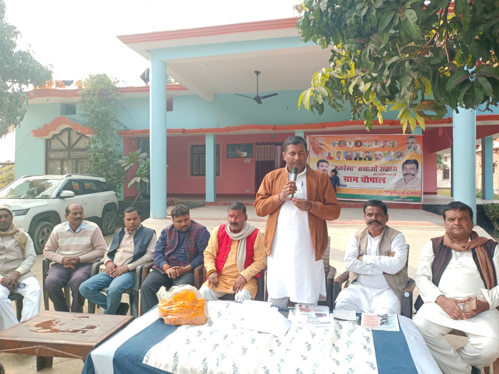 भाटपाररानी, देवरिया(राष्ट्र की परम्परा)। पूरे देश में कांग्रेस द्वारा चलाए जा रहे मनरेगा बचाओ जन चौपाल कार्यक्रम के तहत कांग्रेस कार्यकर्ताओं ने क्षेत्र के रुस्तम बहियारी में जन चौपाल का आयोजन किया।कार्यक्रम में मनरेगा मजदूरों ने बढ़चढ़ कर हिस्सा लिया। चौपाल को सम्बोधित करते हुए भाटपाररानी से कांग्रेस के विधानसभा चुनाव में उम्मीदवार रहे युवा कांग्रेस के पूर्व राष्ट्रीय अध्यक्ष केशवचन्द यादव ने कहा कि भाजपा सरकार को गरीबों, मजदूरों के विकास व उत्थान की कोई चिंता नहीं है, यह मजदूर विरोधी लोग हैं।मनरेगा जैसी महत्वपूर्ण योजना को समाप्त कर यह सरकार गरीबों को उनके हाल पर छोड़ने का मन बना लिया है।कांग्रेस पार्टी इस योजना को बचाने के लिए अंतिम दम तक संघर्ष करेगी। कांग्रेस जिलाध्यक्ष विजयशेखर मल्ल रोशन ने कहा कि यूपीए सरकार ने डॉ मनमोहन सिंह के नेतृत्व में इस महत्वाकांक्षी योजना को लागू किया था कि रोजगार के लिए किसी भी मजदूर को परिवार छोड़ कर परदेश न जाना पड़े, लेकिन यह सरकार इसे बंद कर मजदूरों के साथ अन्याय कर रही है। जिला उपाध्यक्ष डॉ धर्मेन्द्र पांडेय ने कहा कि हर कांग्रेस कार्यकर्ता इस योजना को पुनः स्थापित करने के लिए लड़ाई लड़ रहा है इसके लिए गांव गांव जाकर चौपाल के माध्यम से जागरूकता अभियान चलाया जा रहा है। मनरेगा के जिला कोआर्डिनेटर सत्यप्रकाश मिश्र अंशु ने कहा कि सिर्फ कांग्रेस ही मजदूरों का हित चाहती है। चौपाल को ब्लॉक अध्यक्ष सत्यपाल सिंह कुशवाहा, वरुण राय,विनोद दूबे, धुर्व प्रसाद आर्य,सलीम अली,सत्यम पांडेय,गौरीशंकर यादव,एडवोकेट शालिनी,छोटेलाल यादव,रामअवध यादव, रवींद्र मल्ल आदि ने सम्बोधित किया।